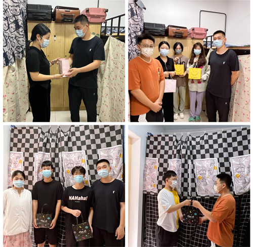 随后副主任虞骏卿带领辅导员一同走进学生寝室,送上精美的定制礼袋和温暖的中秋祝福。同时与同学们展开面对面交流,安抚同学们的思乡之情,勉励他们保持乐观向上的心态,合理规划中秋假期生活,做好疫情防控,努力成为更优秀的自己。