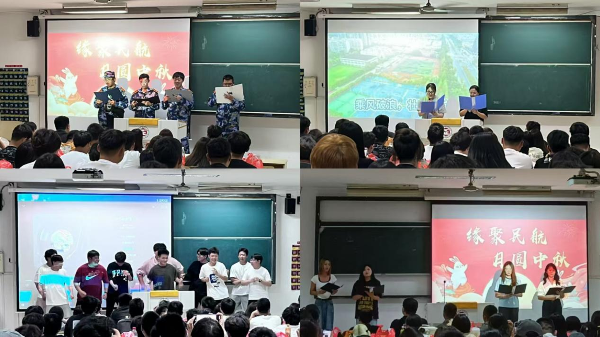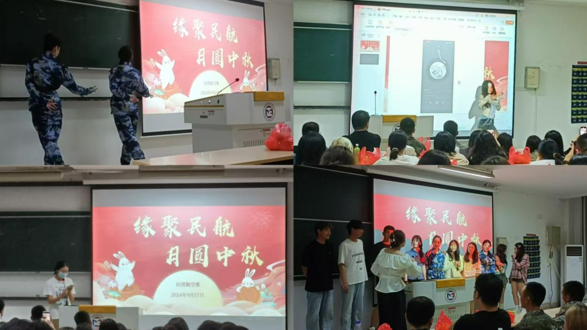 海上生明月,天涯共此时。中秋意味着团圆,节日代表着欢庆,民航系近300名新生在军训中度过此次中秋佳节。为了给新生们留下美好回忆,民用航空系于9月17日中秋当天晚18:30在1号教学搂1202、1203教室举办“缘聚民航 月圆中秋”主题新生联欢会。