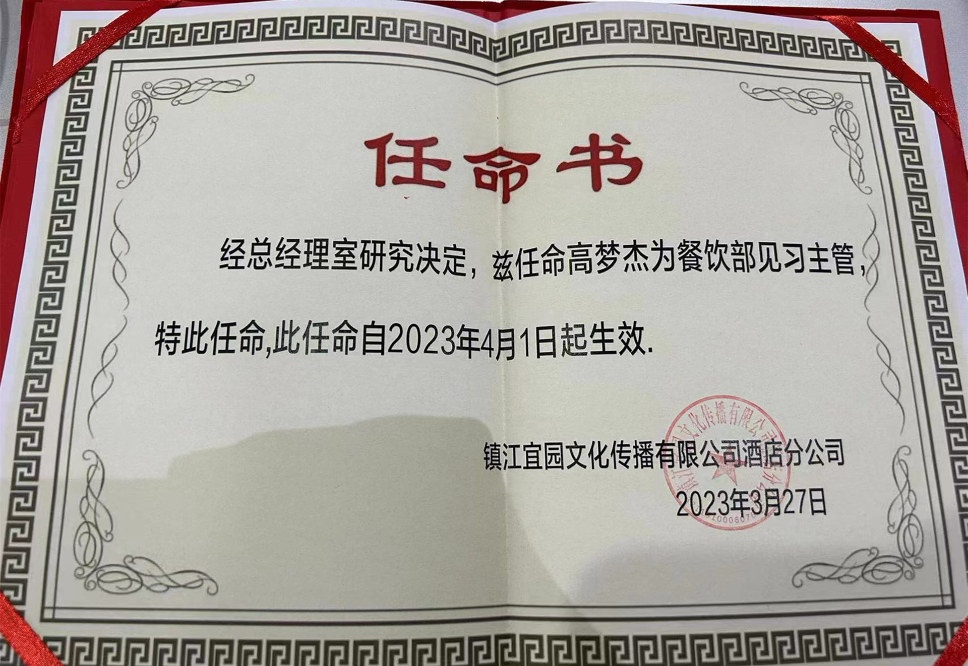 高梦杰是我院民用航空系空乘专业2020级学生。在校期间,她认真对待每一门课程,用心掌握每一项专业技能知识。2022年进入镇江宜园酒店实习,工作认真勤奋、吃苦耐劳、尽职尽责。实习结束后顺利被镇江宜园酒店录用,在“2022年度优秀员工表彰大会”中获得了“优秀服务奖”并且被任命为餐饮部见习主管。