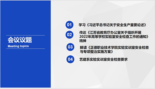会议分为四部分议题,大家学习《习近平总书记关于安全生产的重要论述》,了解《江苏省教育厅办公室关于组织开展2022年高等学校实验室安全检查工作的通知》中提出的工作要求,谢主任为大家解读了《blh漫画 实验实训室安全检查与专项整治实施方案》,并提出在本系实验实训室安全管理工作中要达到的各项要求。