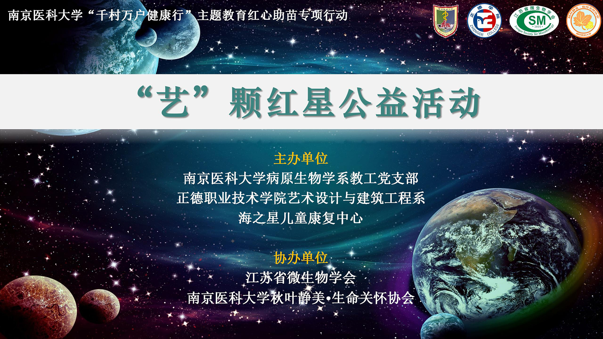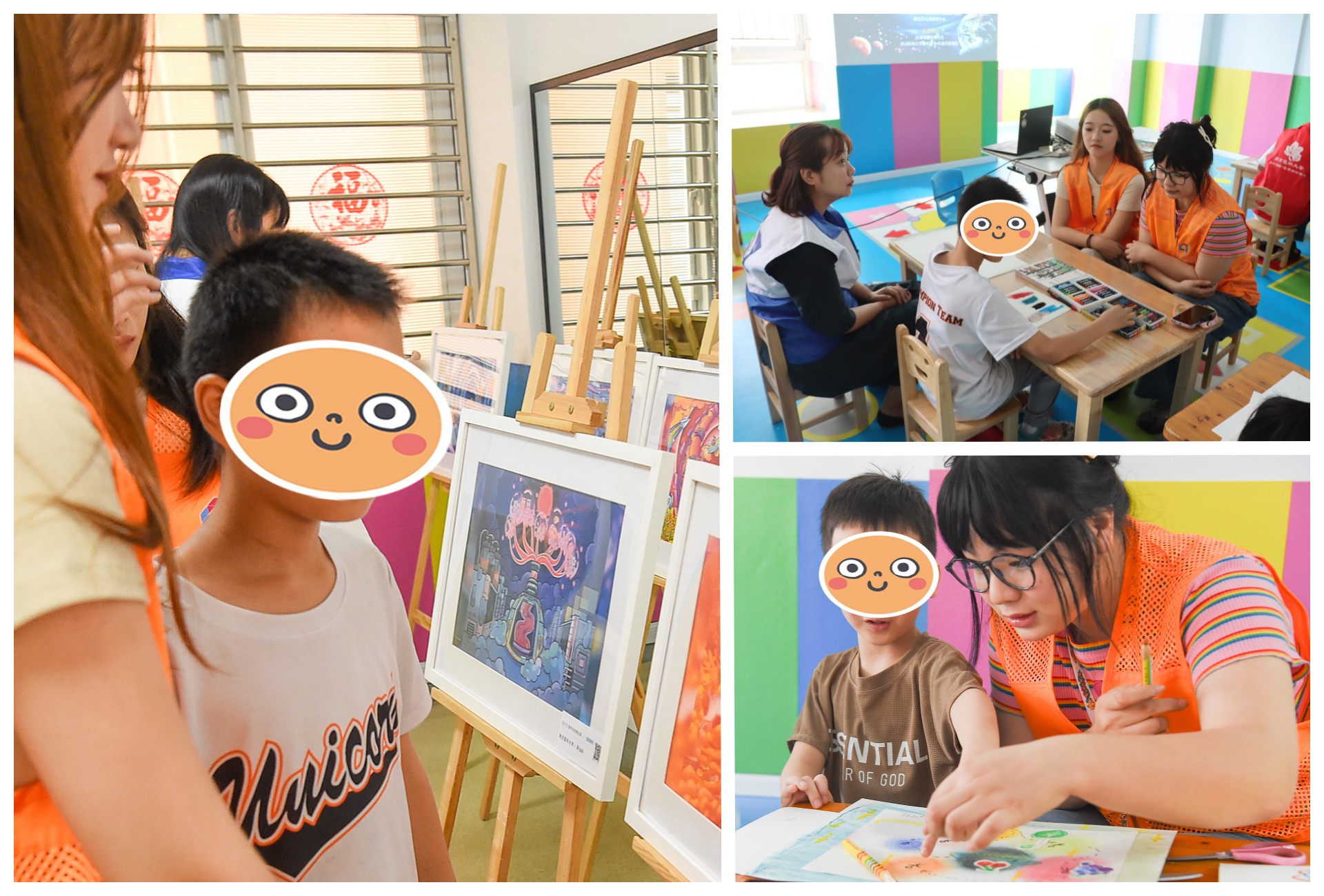 此次公益活动共分为绘画创作、科普讲座与插画展览三个部分。在“‘艺’ 颗红星——我们的天空”主题单元,正德学院的徐老师向孩子们介绍了宇宙、行星和中国航天知识,以精美的图片和视频引导大家畅想宇宙之美。引导结束后,在南医大与正德学院师生志愿者们的帮助下,孩子们尝试用色粉、彩铅、油画棒涂抹着自己心中的宇宙,稚嫩的笔触和绚烂的色彩形成了一幅幅独具想象力和艺术审美的作品,展示了星孩们无以言表但丰富多彩的内心世界。
