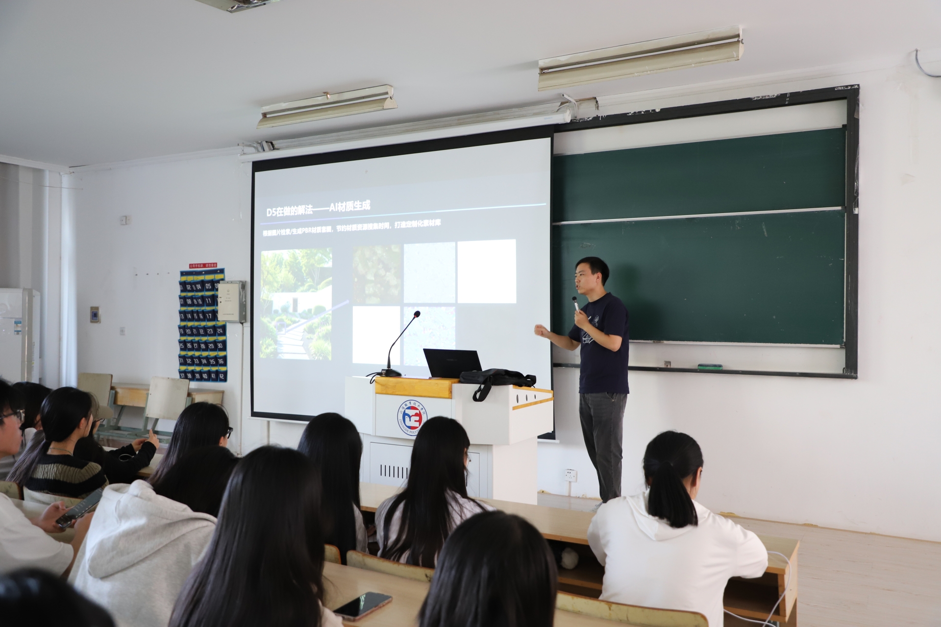 接着维伍科技技术专家钱江悦为全体师生进行了D5渲染器教育版入门基础培训讲解,详细介绍了材质模块、景观植物、建筑体块、动态粒子、室内单品等多主题素材资源库应用方法,素材工具搭建场景和参数设置的技巧。现场操作演示了建筑动画的视频创建功能和实时渲染的编辑方法。其实时操作的效果引起了学生极大的兴趣。最后强调了D5软件操作虽简单,但同时需要大家经验的累积和思考才能熟练更多的技巧,只要有专业的敏感度和软件学习的热情度就一定能够快速使用好D5渲染器,让软件为自己的设计创想服务。
