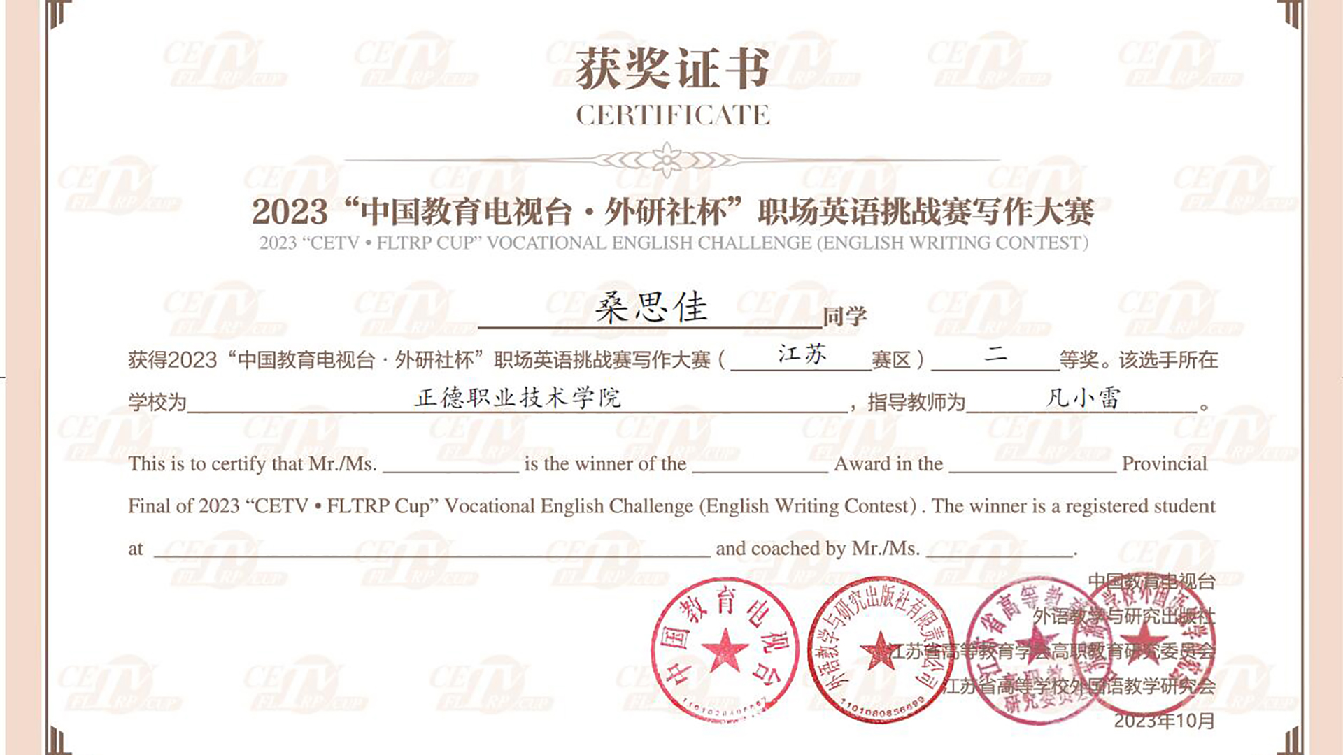 近日,2023年“中国教育电视台•外研社杯”职场英语挑战赛江苏赛区英语写作大赛在扬州举行,blh漫画 共派出三位同学参赛,经过激烈角逐,来自艺术设计与建筑工程系2022级新闻专业桑思佳同学荣获二等奖。
