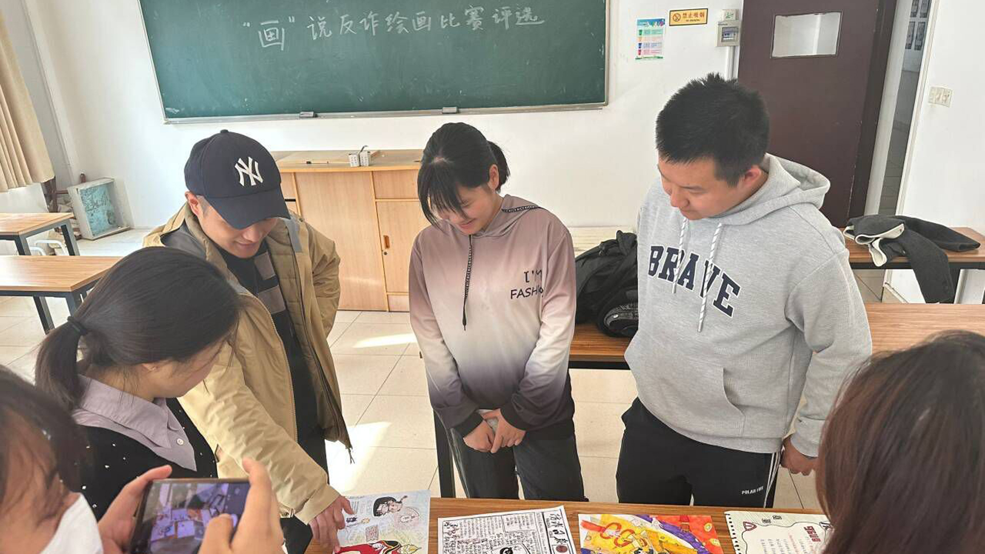 两位班主任老师认真查看了每位同学的作品,分别从海报排版、纸张大小、绘画技巧、色彩以及文字分布等方面给出了专业性的指导,建议同学们要:爱护自己的作品、突出作品的主题、运用好色彩的明暗、协调好文字布局等。同学们也虚心听取班主任的意见,纷纷表示要努力在日后的作品比赛中取得更大的进步。