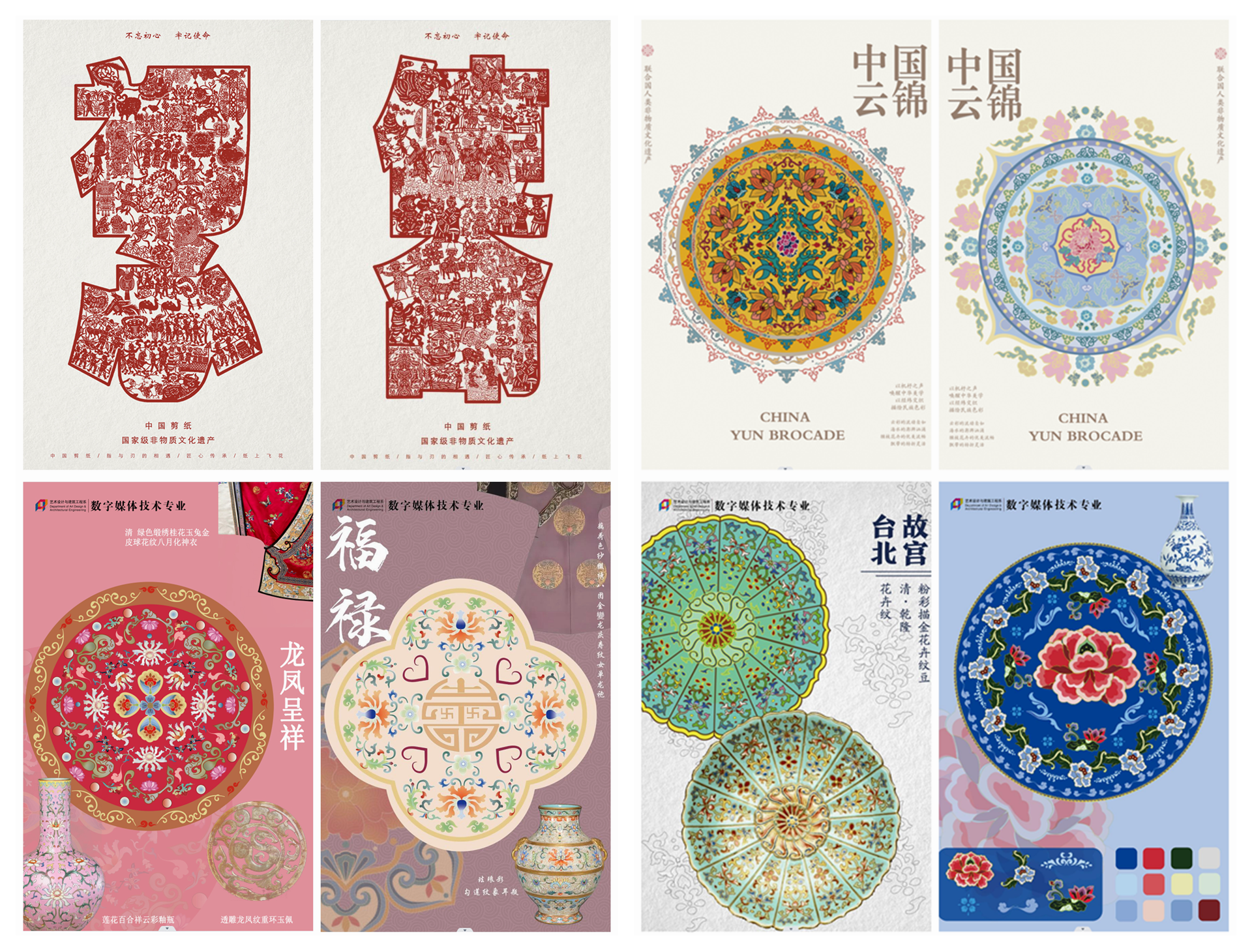 本次展出的作品围绕《传统纹样再设计》《我给文物画肖像》《非遗文化海报设计》三个主题进行设计。课程中注重培养学生的实践能力和创新精神,通过数字视觉的表现手法,同学们将思政课程中的知识点、案例和理念转化为生动的图像,使观众在欣赏中感受到思政教育的魅力与力量。