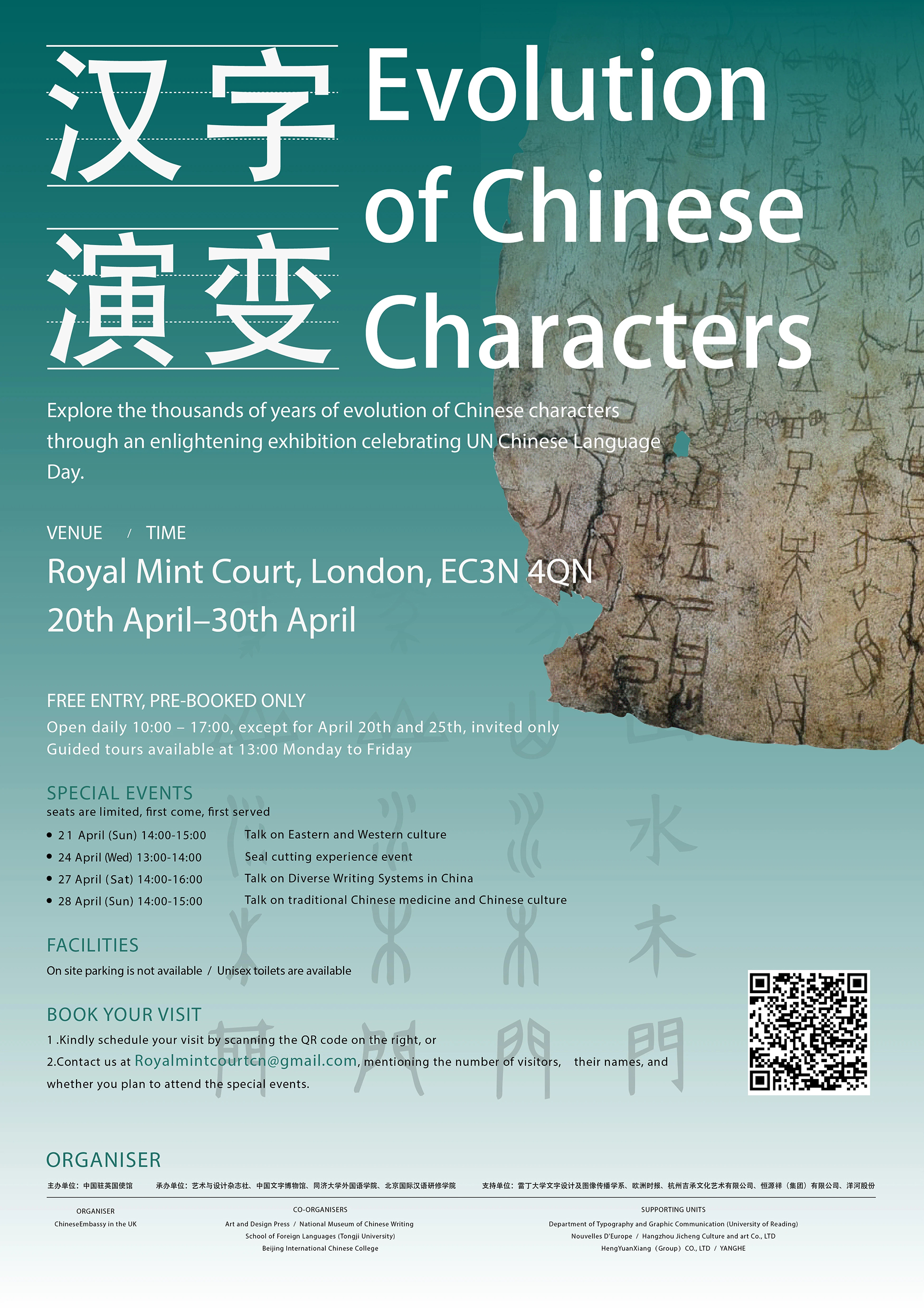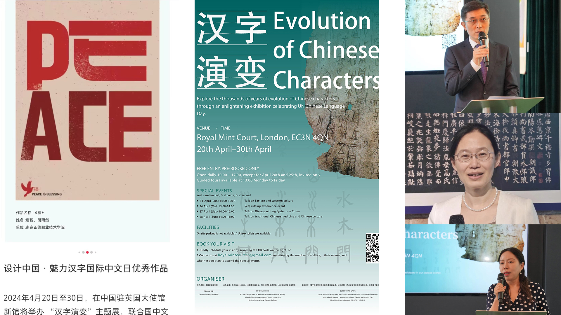 2024年4月20日至30日,在中国驻英国大使馆新馆将举办 “汉字演变”主题展。作品征集活动的消息一经发布,得到设计界人士的广泛关注与积极参与。在中国文字博物馆组织了相关专家进行了海报作品评选,评选出优秀作品40幅(组),在中国驻英国大使馆展出。