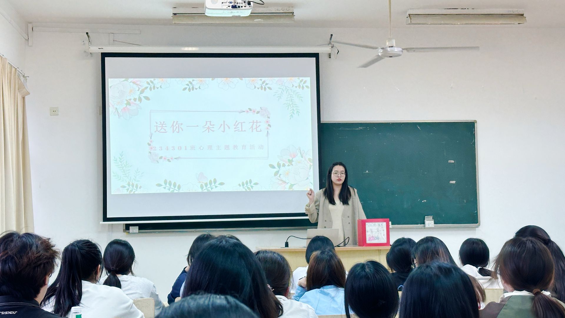 为了增加活动的互动性和趣味性,王思思老师还特别准备了一个学生自制的心理盲盒。同学们将自己的小红花贴纸小心翼翼地放入盲盒中,期待着能够为他人带去一份意外的惊喜和鼓励。随后,大家轮流从盲盒中抽取一朵小红花,阅读上面的寄语,感受那份来自同学之间的真挚关怀和力量。