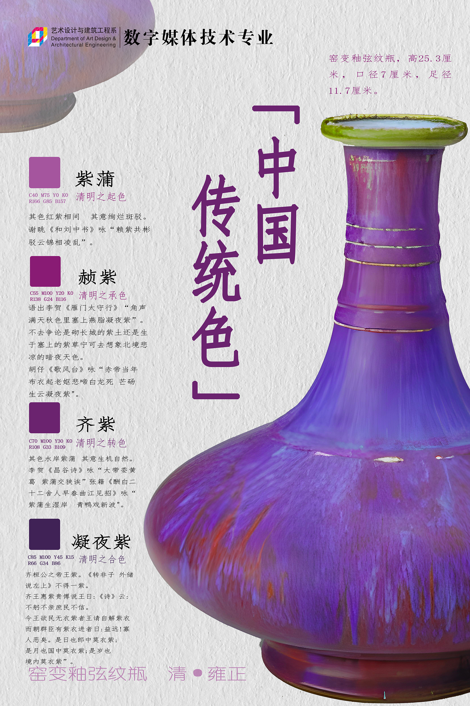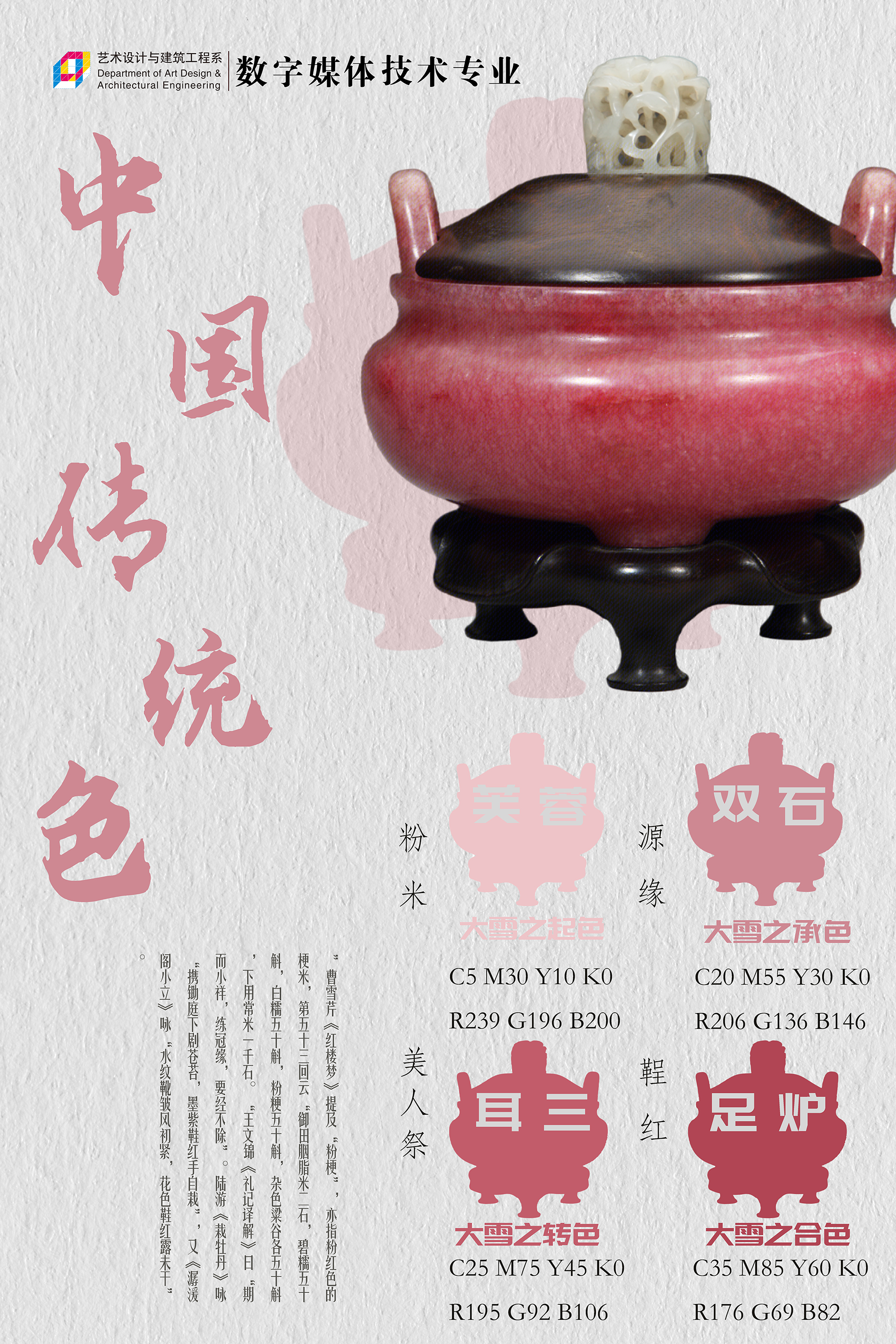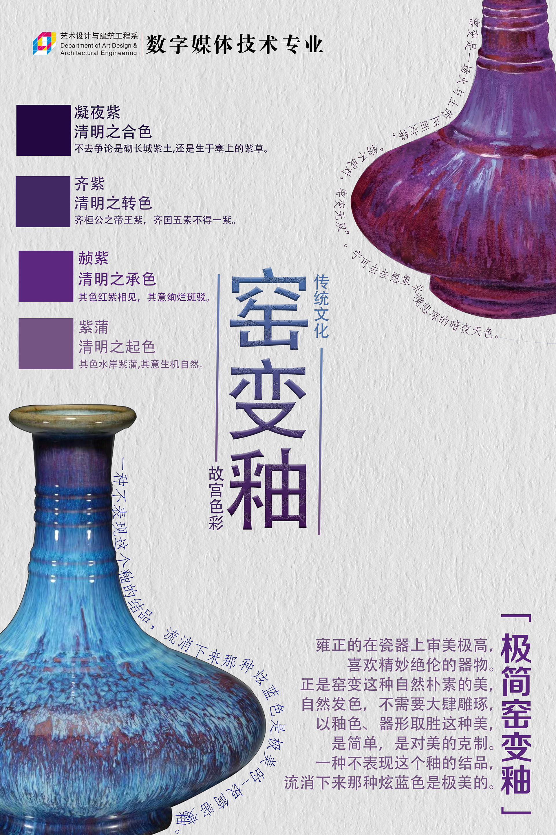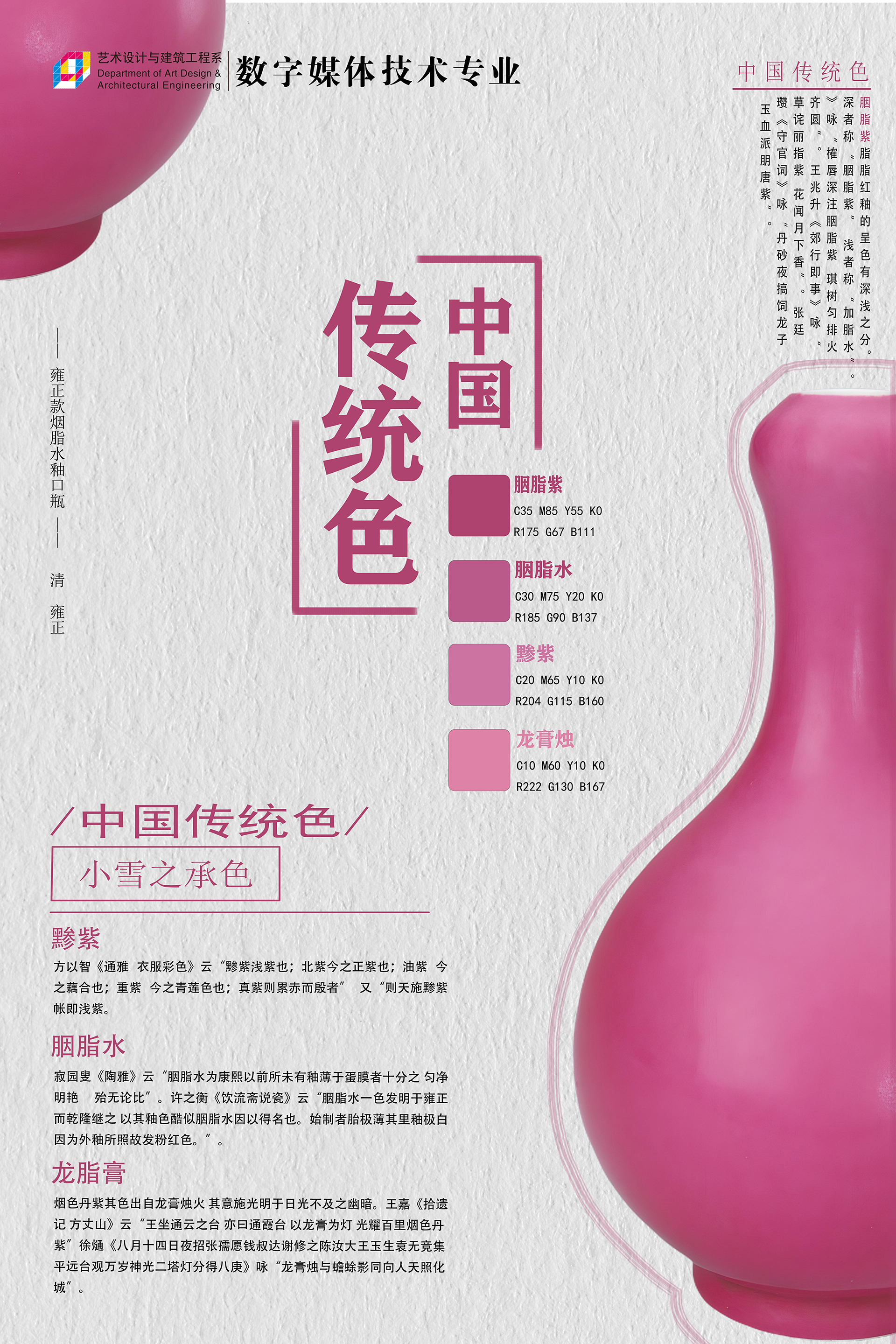 中国传统色彩作为中华文化的重要组成部分,有着深厚的历史渊源和文化内涵。本次海报设计展以“中国传统色”为主题,展出了来自数字媒体技术专业学生设计的四十余幅海报作品。每一幅作品都巧妙地融合了中国传统色彩和现代设计元素,展现了学生们的创造力和艺术表现力。