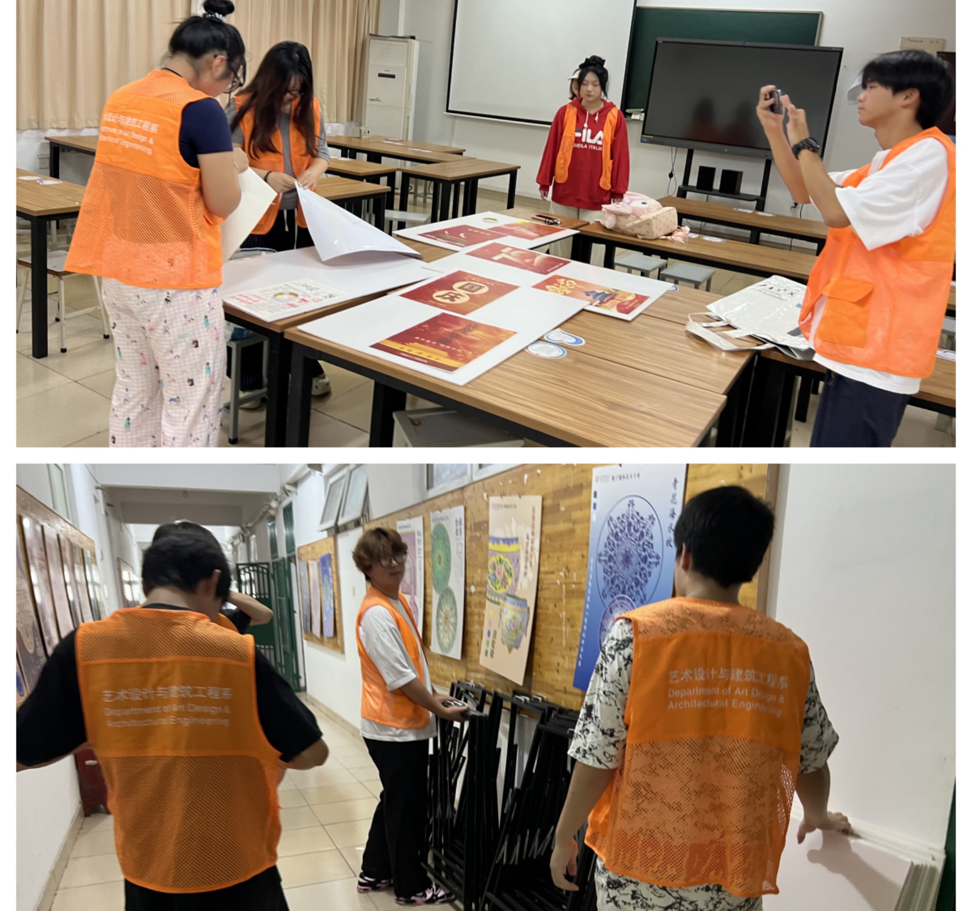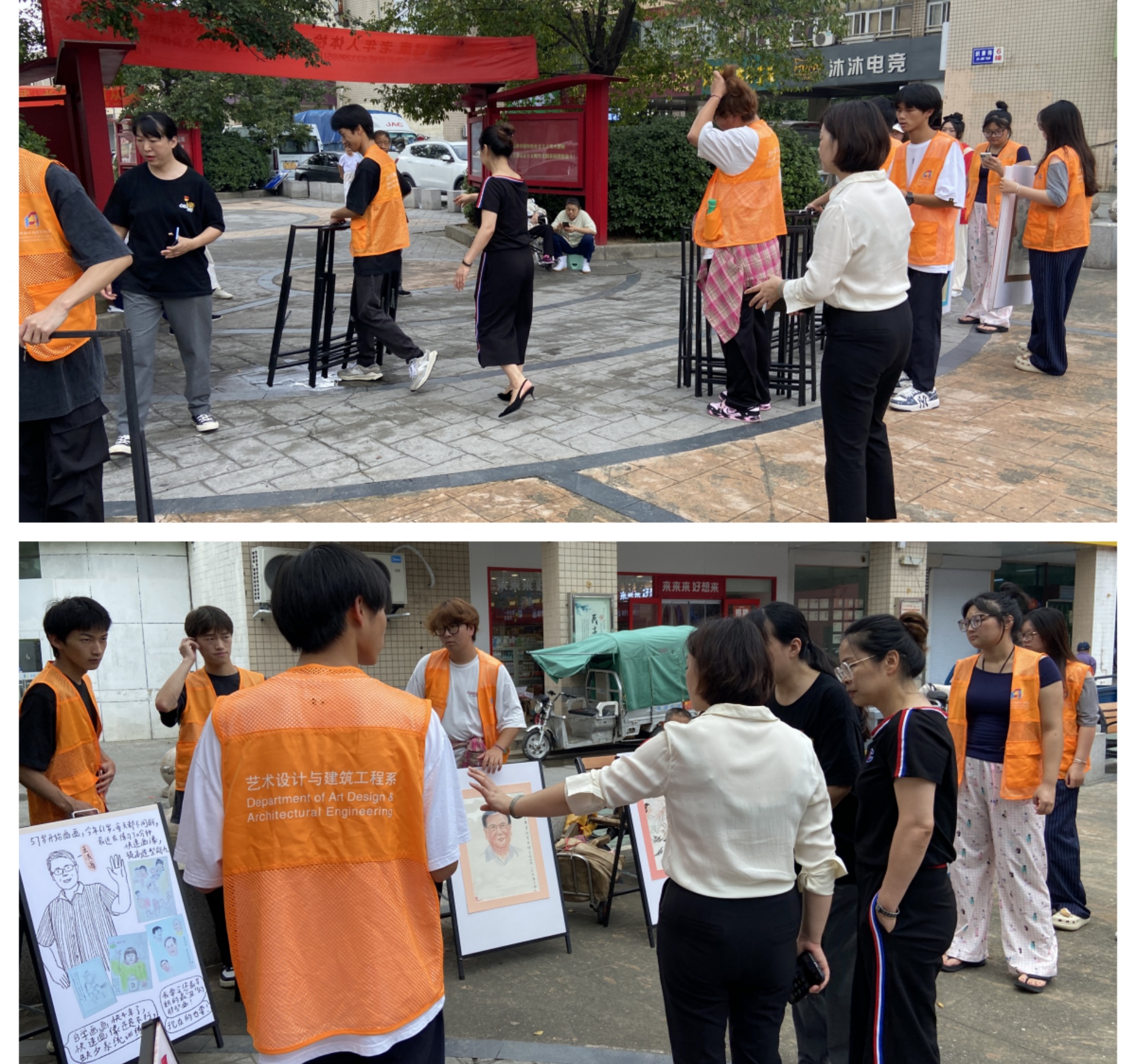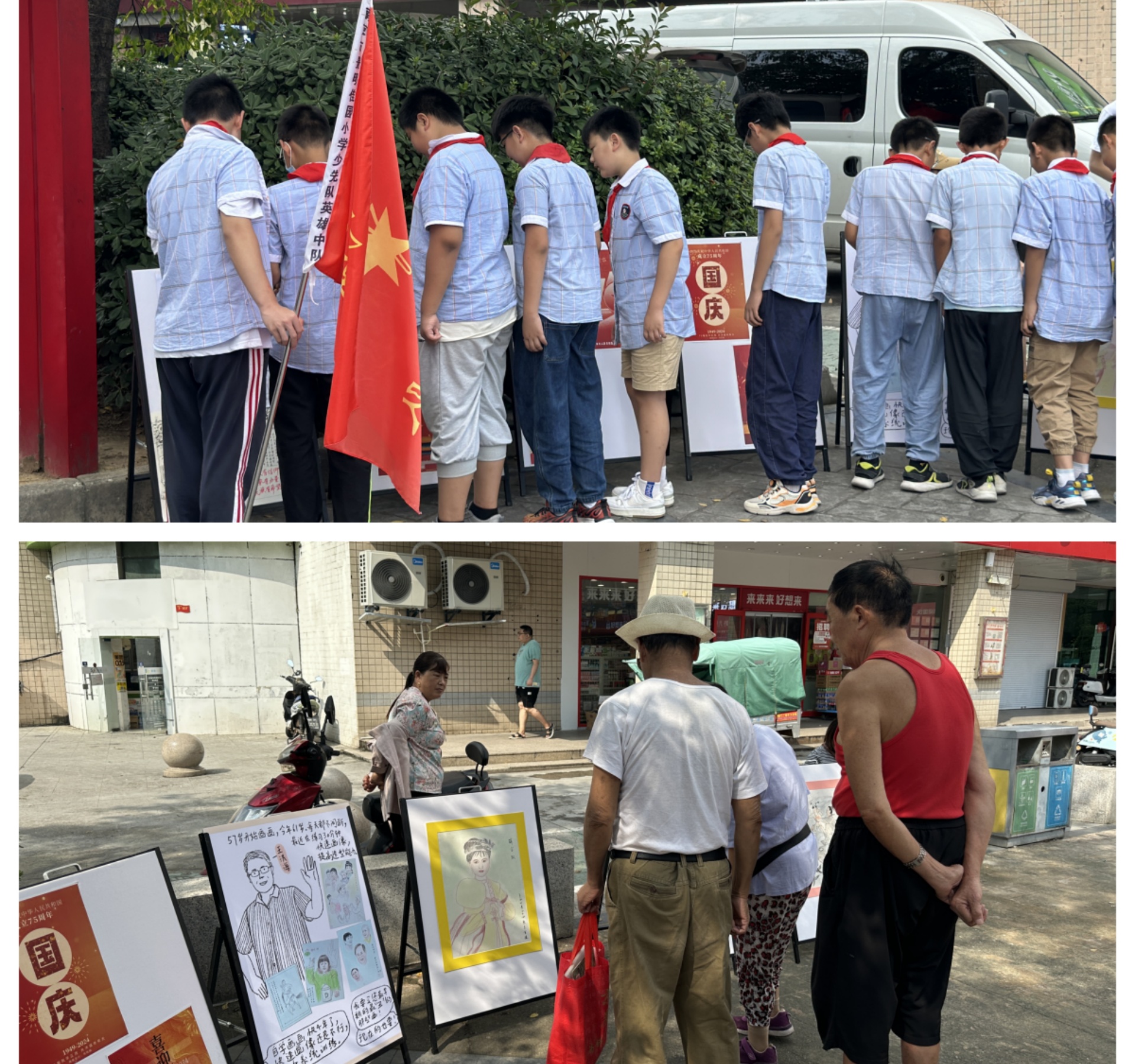签约仪式后,双方首次开展了国庆画展活动。为了庆祝中华人民共和国成立75周年,艺术设计与建筑工程系专业教师徐嘉嘉指导本系学生开展了庆祝画报的设计制作,携手景明佳园社区进行画报展览。活动过程中,艺术设计与建筑工程系党支部书记杨春娟、景明佳园社区红旗党支部书记李正红共同指导现场布置,学生志愿者们热情参与,积极行动,喜闻乐见的画作吸引了社区居民的驻足。
