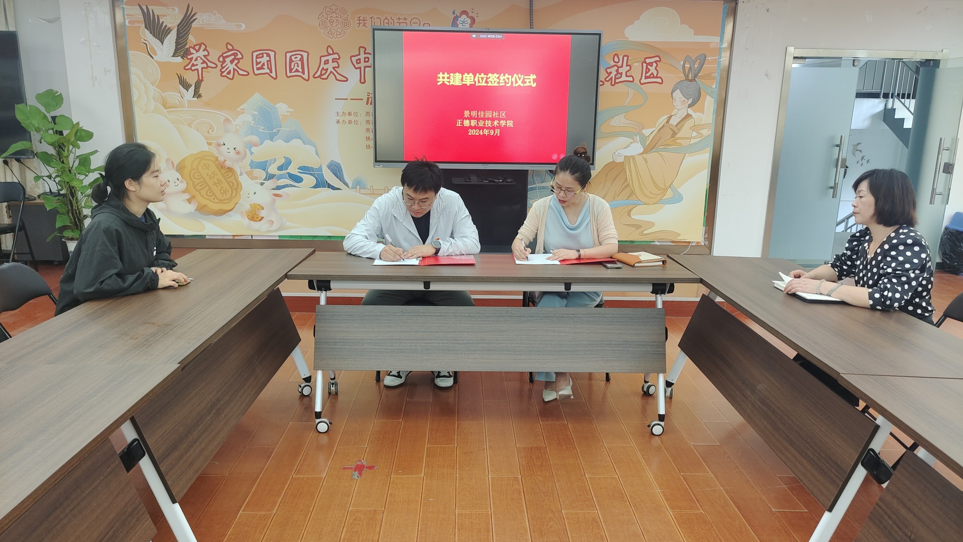 艺术设计与建筑工程系党支部书记、副主任杨春娟与景明佳园社区党委书记王鹏此前进行了签约仪式,并于5月27日开展“礼献中华,画展传情”社区志愿服务。