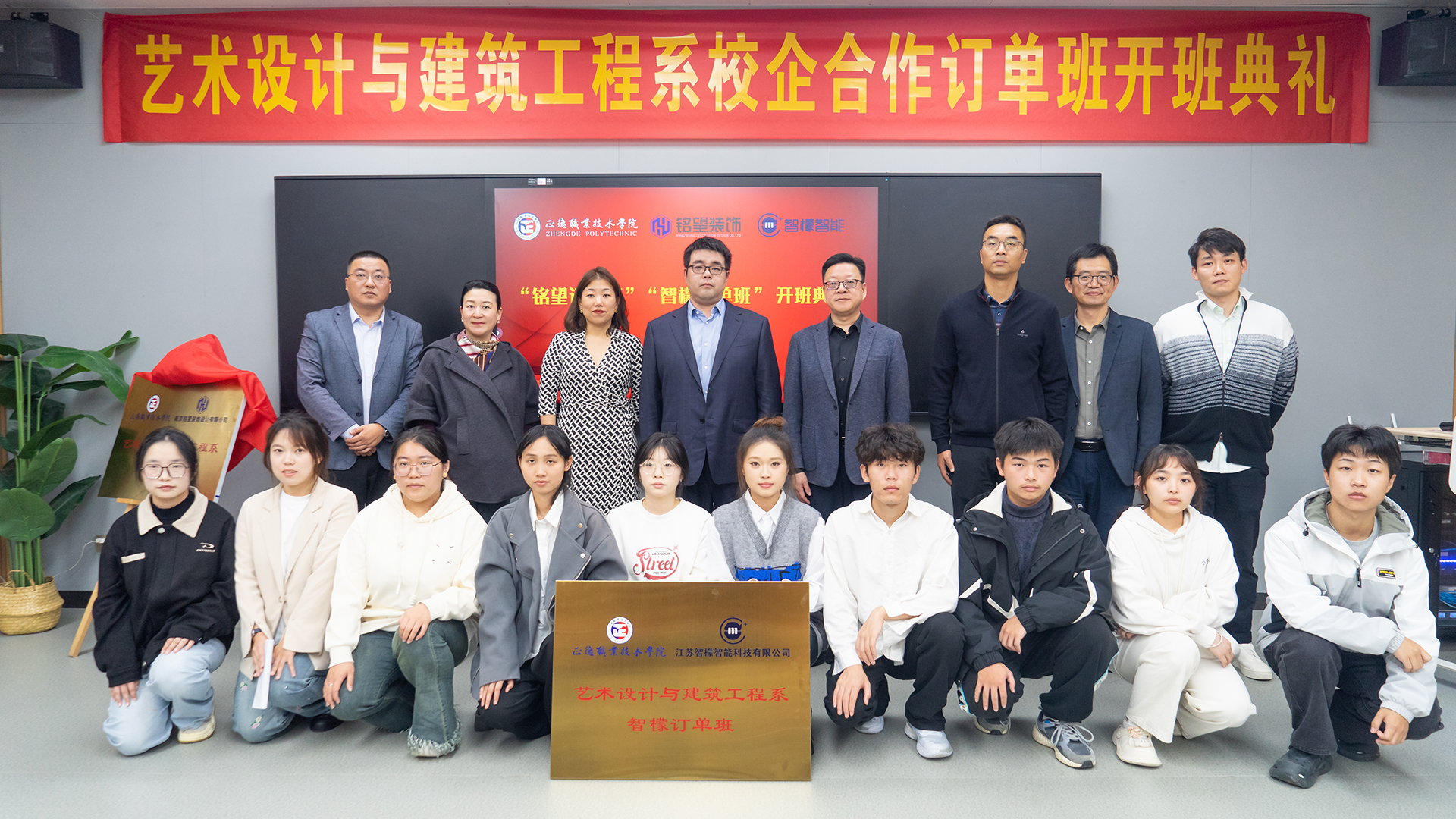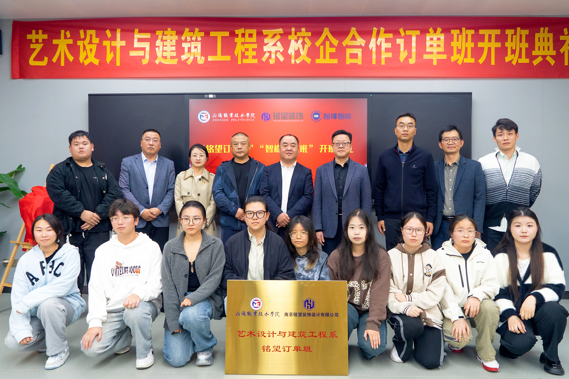 仪式伊始,与会人员共同观看了南京铭望装饰有限公司和江苏智檬智能科技有限公司的企业宣传片,深入了解了这两家公司在装饰设计、智能科技领域的卓越成就和发展愿景。随后,艺术设计与建筑工程系主任周卫上台致辞,对两家公司长期以来对学院人才培养工作的鼎力支持表示衷心感谢,并期待未来双方能在更多领域开展深度合作,共同提升人才培养质量。