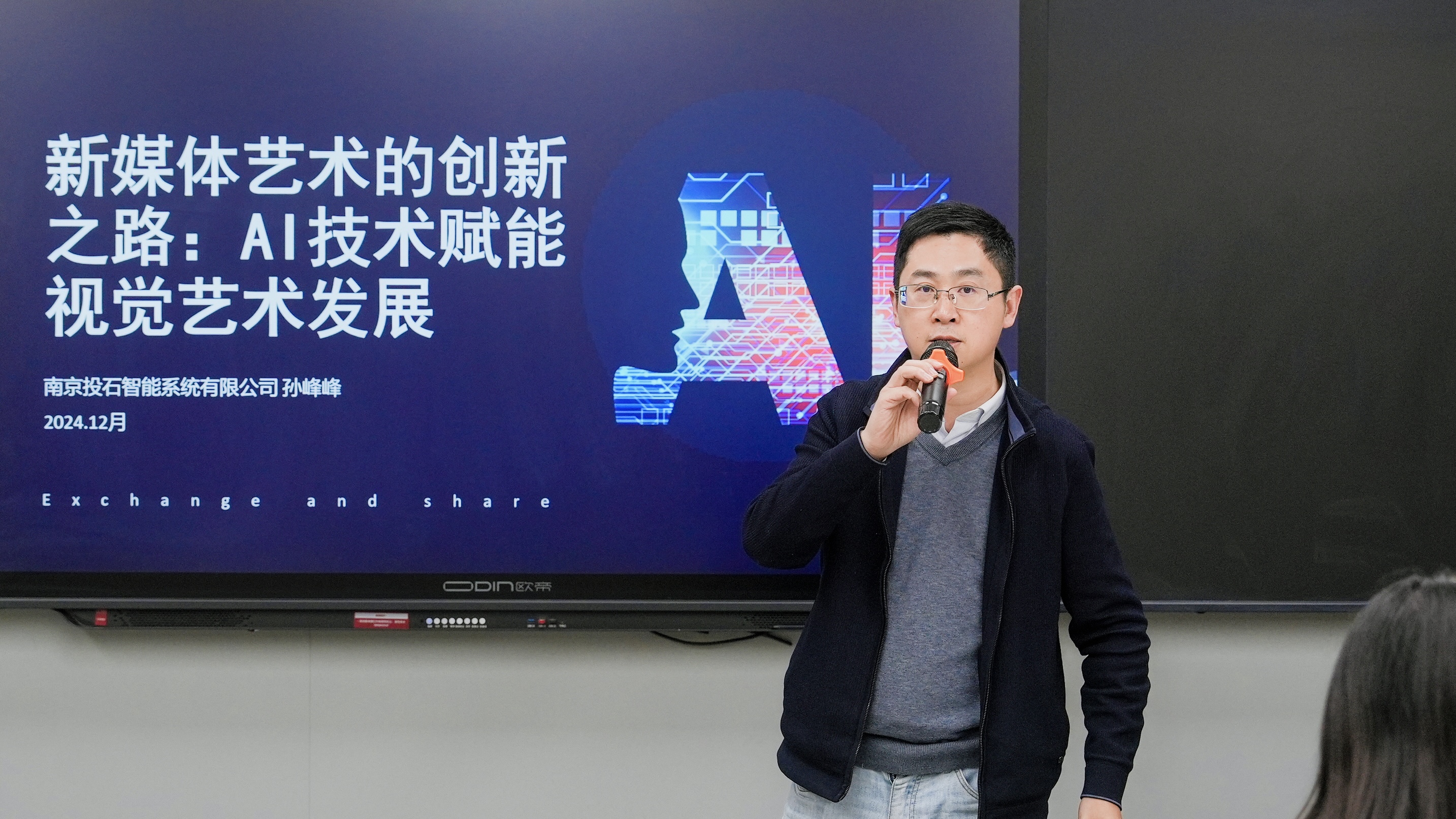 12月5日下午,南京投石智能系统有限公司董事长孙峰峰受邀来到我校艺术设计与建筑工程系,为数字媒体技术专业的师生带来了一场题为《新媒体艺术的创新之路:AI技术赋能视觉艺术发展》的精彩讲座。系主任周卫、副主任陆松及党支部书记杨春娟等领导出席了此次讲座。