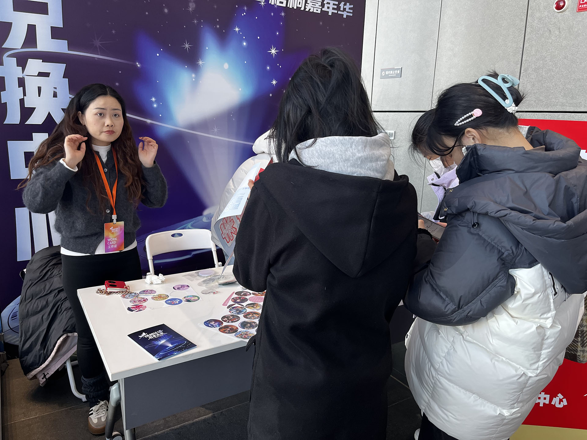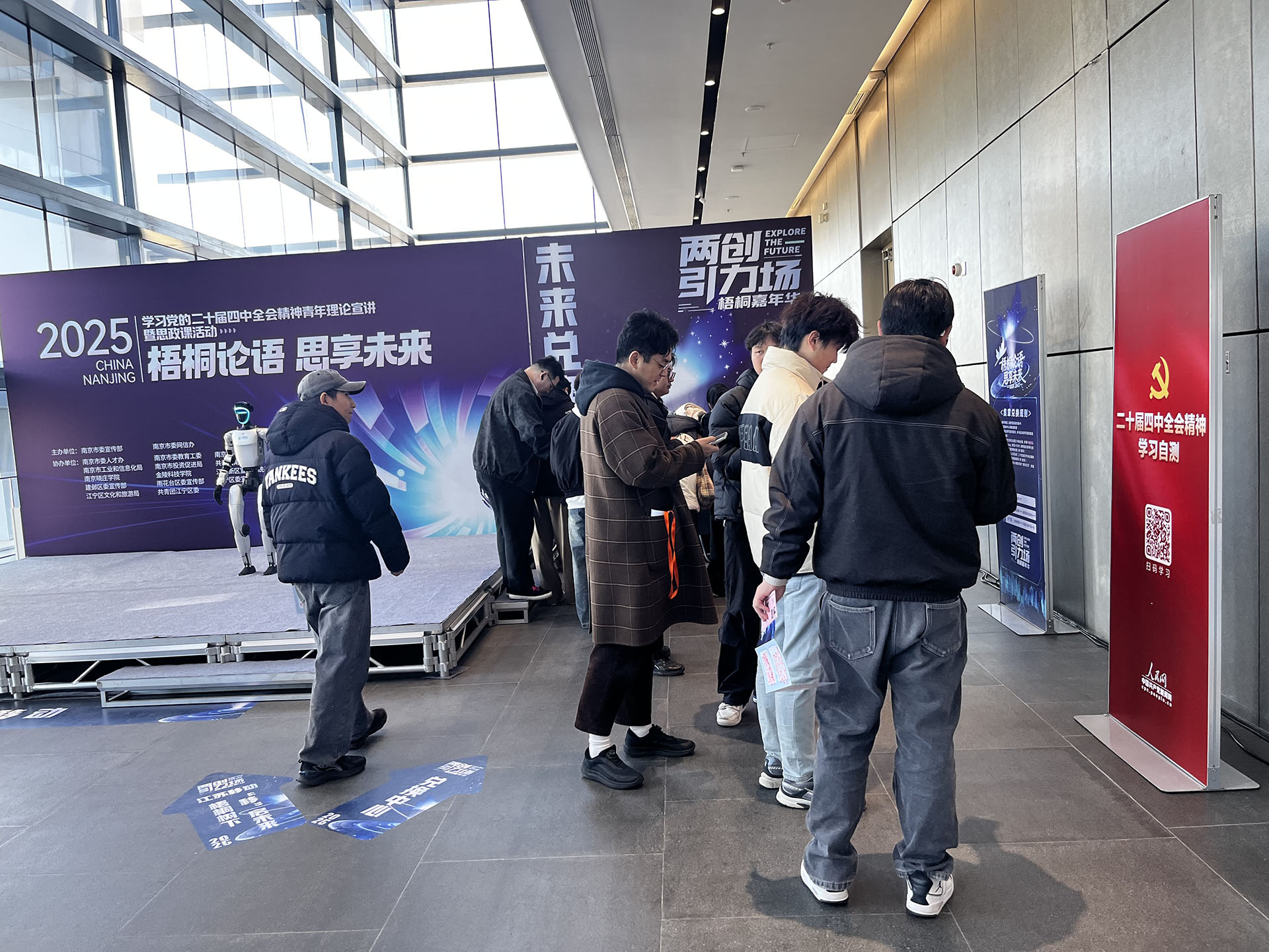 在“两创引力场”科创展区,同学们与全球首款防爆人形机器人“天魁1号”互动,体验江苏集萃咖啡机器人、南大电子“杜杜”智慧服务机器人,并用课堂所学的AIGC生成技巧现场为展商优化导览界面,收获点赞盖章与活动礼品。随后,大家聆听紫金山实验室、国家电网南瑞集团、天创智能等青年工程师讲述6G领跑、虚拟电厂、防爆人形机器人、垂直视频大模型背后的“十年磨一剑”故事,深刻体悟“科技自立自强”的青春担当。