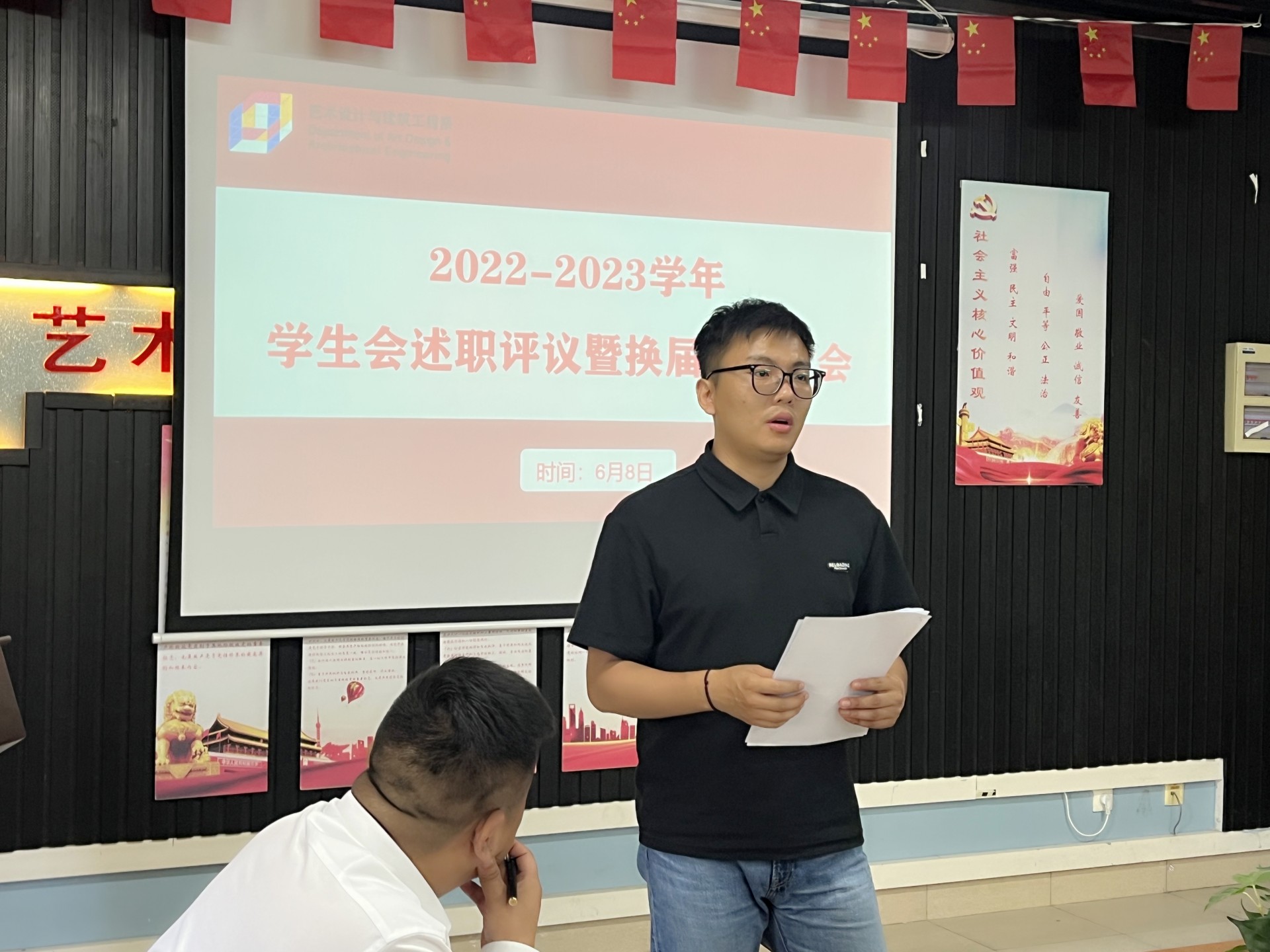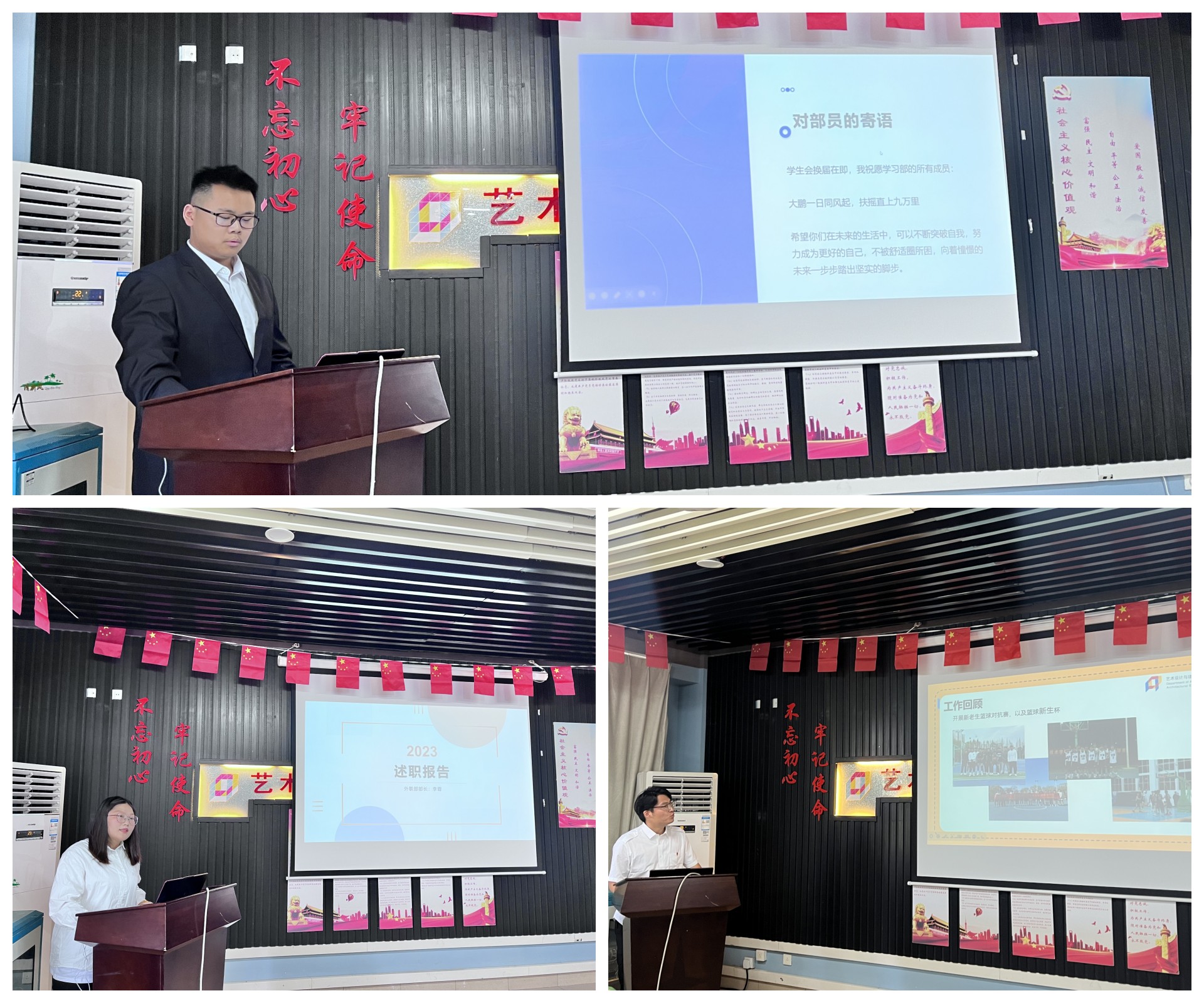 最后,党支部书记陈宏波对各学生会干部颁发聘书并对本次述职评议大会进行总结。对艺建系学生会干部一年以来的辛勤付出表示感谢,并表示未来一届学生会的同学们要不断提高思想觉悟并及时在活动中总结经验教训、定期反思、树立全局意识,要继续保持认真严谨的工作态度,牢记服务宗旨,希望学生会在未来能够以更加饱满的姿态持续前进。同时,加强部门内的沟通交流,多与其他兄弟系部学习交流。