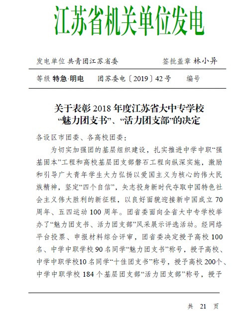 近日,共青团江苏省委下发《关于表彰2018 年度江苏省大中专学校“魅力团支书”、“活力团支部”的决定》(团苏委电〔2019〕42号),我院1名同学获评“魅力团支书”,1个团支部获评“活力团支部”。