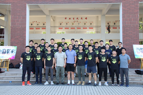 校友们身着建队15周年纪念T恤和老师们在创新楼前合影