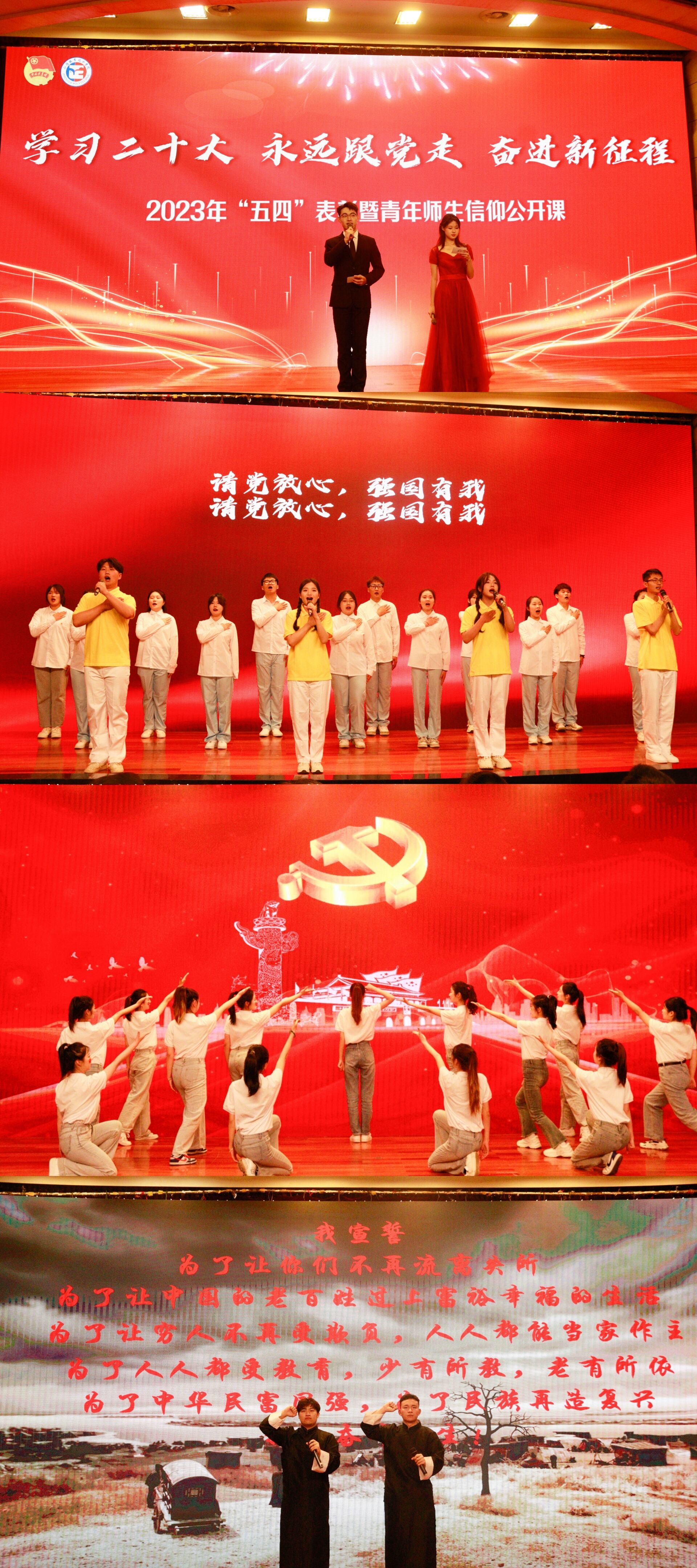 活动在嘹亮的国歌、团歌中拉开帷幕,本次“五四”表彰暨青年师生信仰公开课由“牢记嘱托 · 强国有我”、“紧跟党走 · 奋斗有我”、“感恩奋进 · 建功有我”三个篇章组成,深度融合朗诵、舞蹈、舞台剧等多种艺术表演形式,带领师生沉浸式追忆峥嵘岁月,体验别开生面的学习教育,感悟信仰的力量。