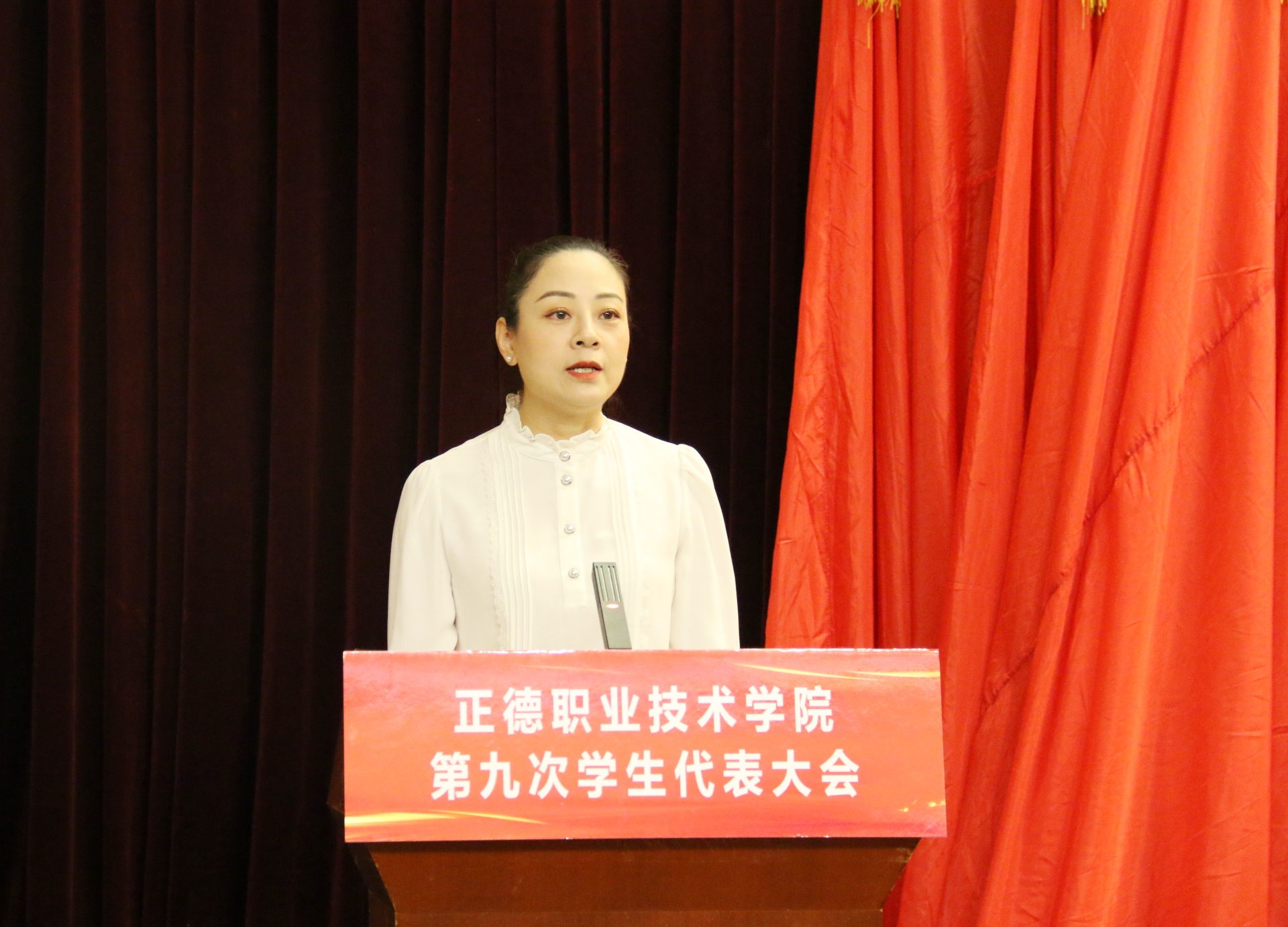 梁薇代表学院党委对本次学代会的召开表示祝贺,向长期以来关心支持我院学生会工作的省学联、兄弟院校表示感谢。她表示,在过去的一年里,我院学生会在院党委和省学联的正确领导下,在院团委的具体指导下,团结带领正德青年学生积极响应全国学联改革号召,坚持依法依章开展工作,在志愿服务奉献、学生权益维护、模范榜样发挥、校园文化建设中发挥了不可替代的作用。同时提出三点希望:一是希望全院广大学生坚定理想信念,勇担时代使命。把习近平总书记对职业教育“大有可为”的殷切期盼转化为“大有作为”的生动实践。二是希望全院各级学生干部练就过硬本领,发挥表率作用。学生干部的首要身份是学生,首要任务是学习,要带头做优良学风的宣传者和执行者。三是希望全院各级学生会组织加强自身建设,赢得信赖支持。要以改革创新精神研究学生会工作面临的新情况、新挑战,打造出师生满意、社会认可、同学信任、朝气蓬勃的先进学生组织。