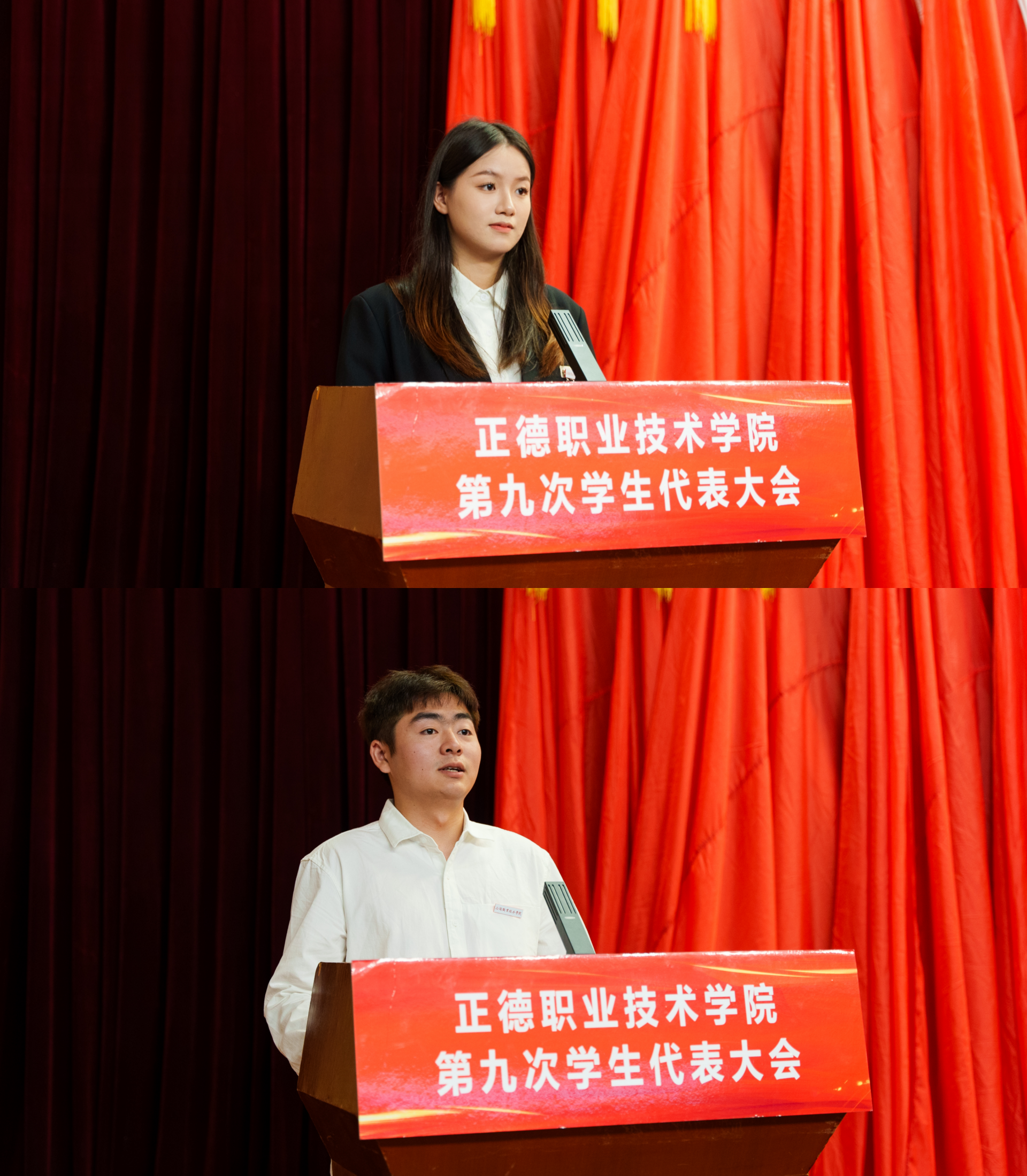 会上,张诗琦同学代表第八届学生联合会委员会向大会作题为《青春盛会担使命 笃行不怠赴征程 为学院高质量发展注入青春动能》的工作报告并向大会汇报第八次学代会提案完成情况,张子健同学代表第九次学生代表大会筹备工作委员会作《正德职业技术学院第九次学生代表大会提案工作报告》。