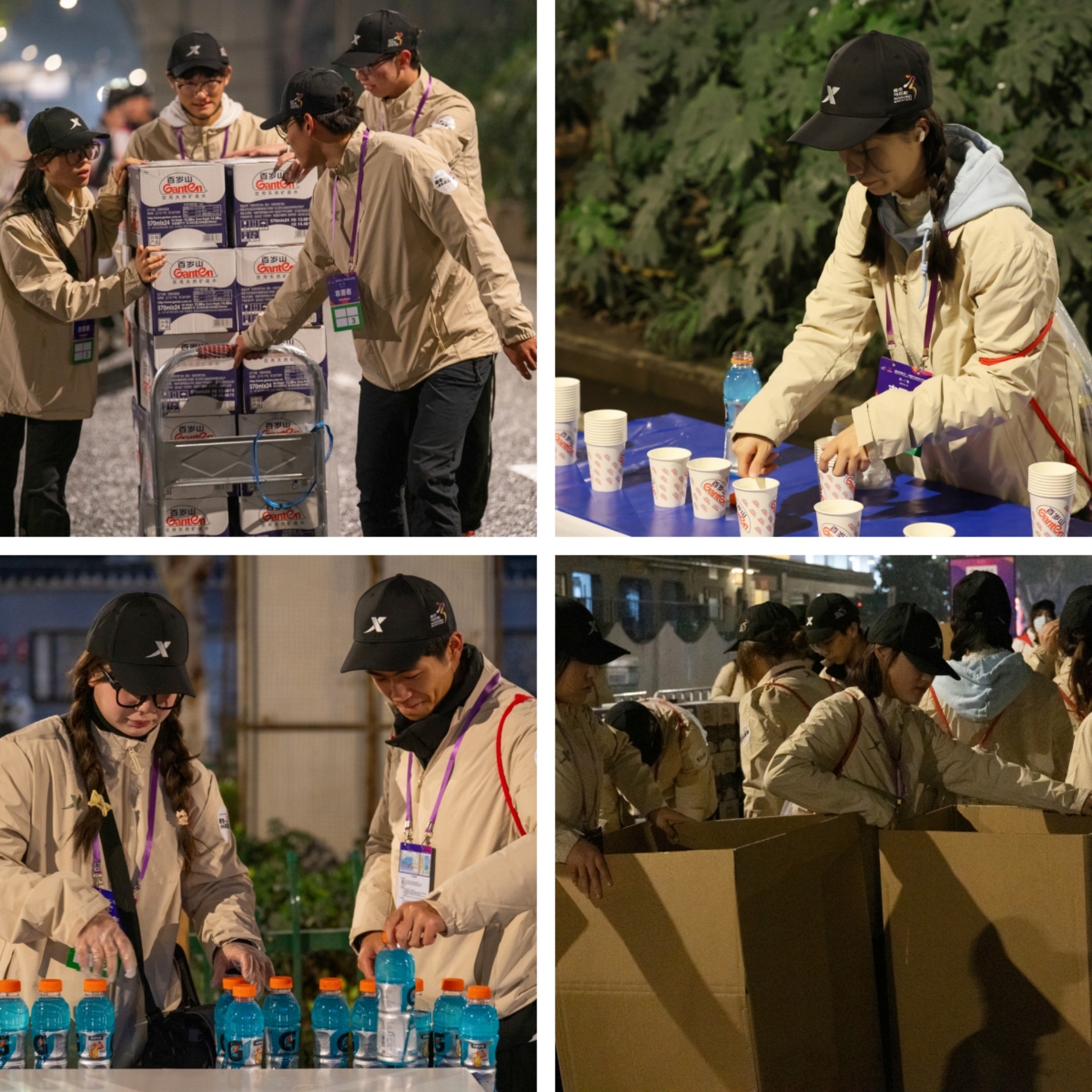 本次南马我院志愿者工作地点在5公里点(近虹悦城)补给处,一共有72个志愿服务点,为3万名参赛选手提供饮用水、功能饮料及能量补给物资。凌晨3点30分,我院志愿者抖擞精神、整装待发,乘车前往服务点集结。尽管车窗外夜色浓厚、寒风刺骨,但依旧遮掩不住志愿者们面庞上洋溢着的兴奋、激动的神情。凌晨4点,全体志愿者井然有序地开始上岗工作。大家首先将物资搬运至各补给点上,搬运过程中不乏女生们的身影。送到站点的物资还要按照比赛要求分批、多次的分门别类摆放整齐,这样精益求精的准备工作为参赛选手的顺利比赛提供了贴心的保障。