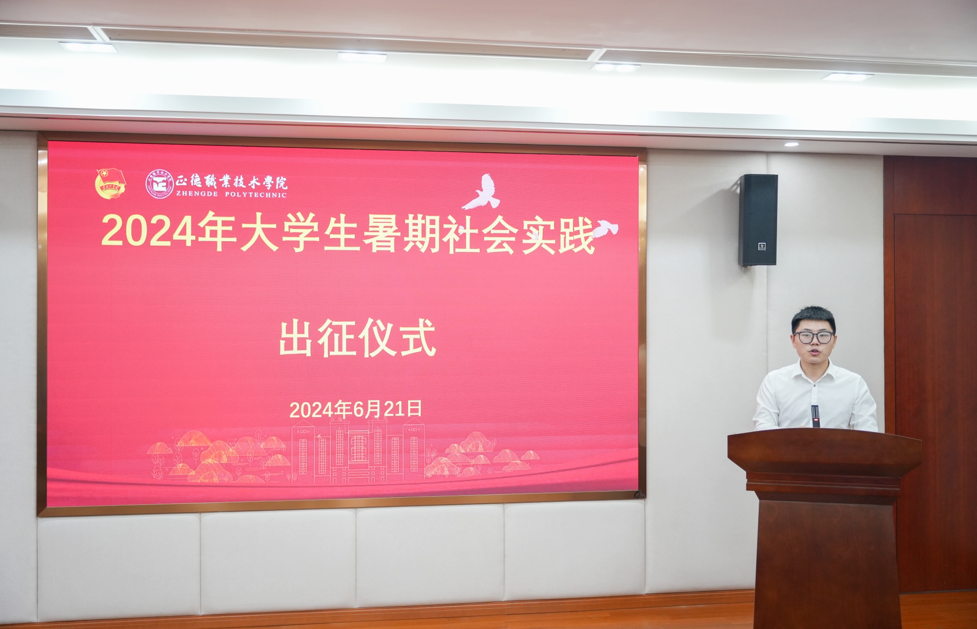 6月21日,我院“青春为中国式现代化挺膺担当”2024年大学生暑期社会实践出征仪式在5201会议室举行。党委学工部部长祝佳俊、各系党支部书记、社会实践团队指导老师、学生代表参加仪式,仪式由团委副书记魏兴彪主持。