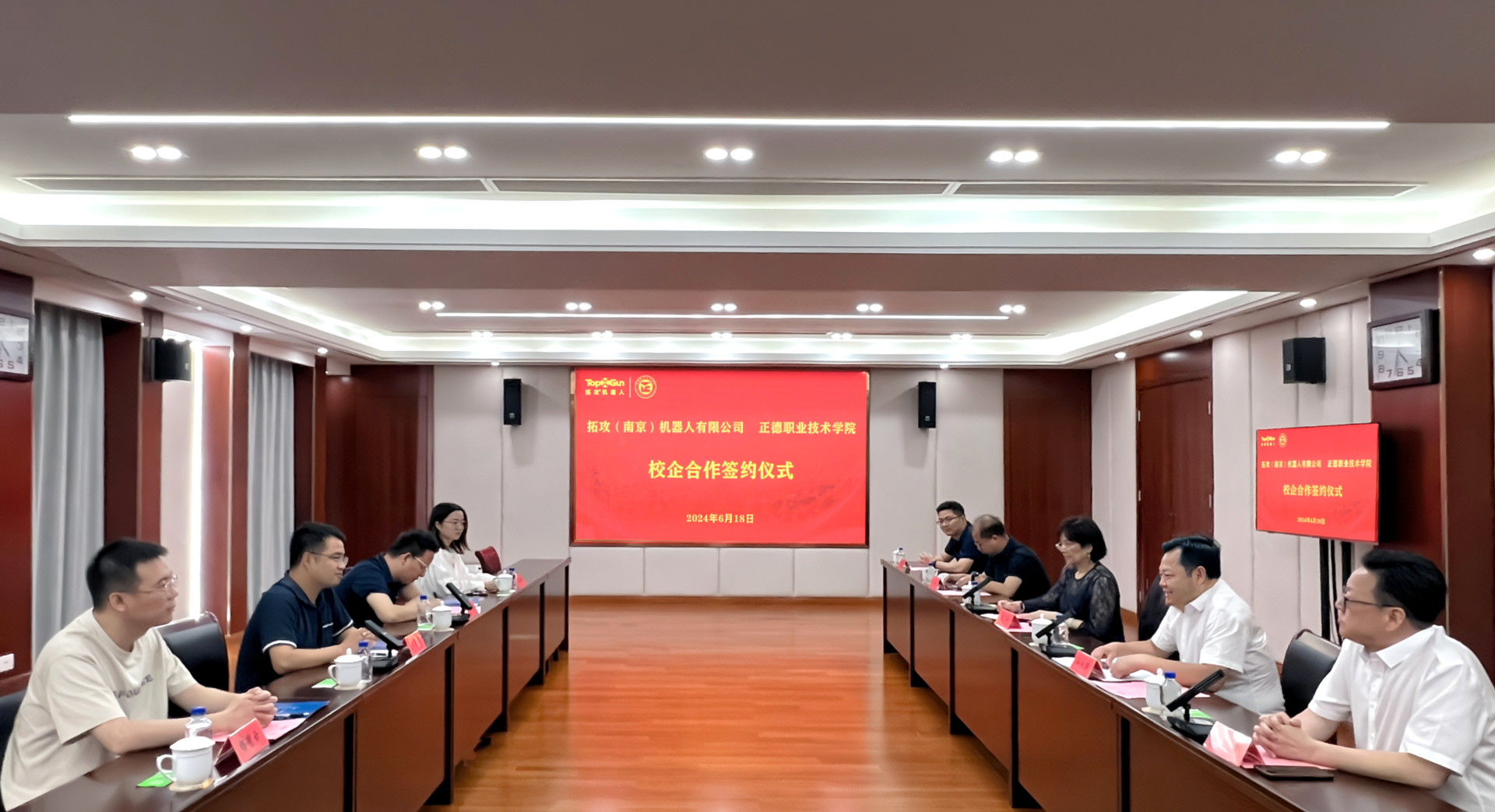 6月18日,blh漫画 与拓攻(南京)机器人有限公司举行了校企合作签约仪式。拓攻机器人联席CEO尹亮亮,自动驾驶技术研究院院长徐进、教育事业部经理杨有运、工业设计总监田静,正德学院院长孙永荣,副院长赵宇、赵凯雷,院长助理、党政办主任王伟,院长助理、招生就业处处长王墀以及相关部门负责人出席签约仪式。仪式由赵宇主持。