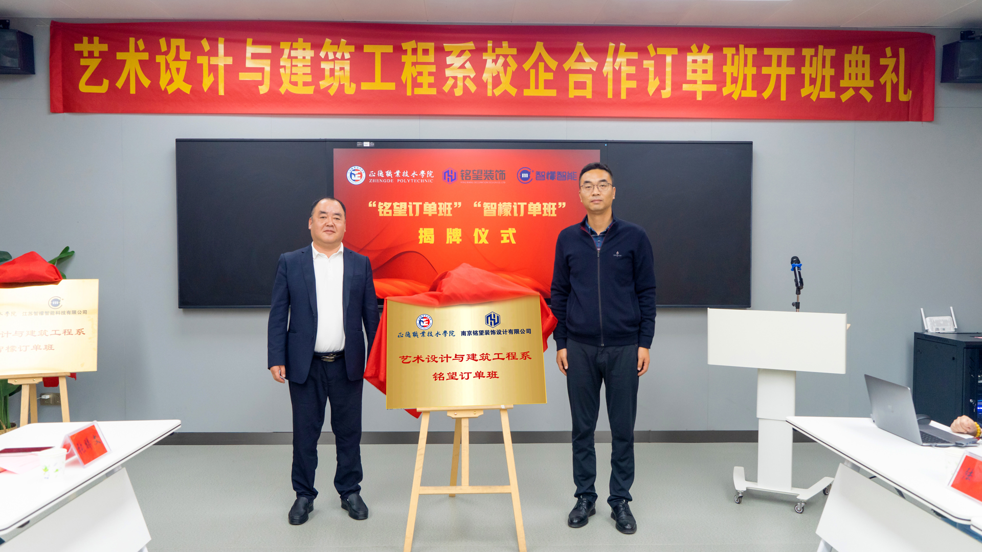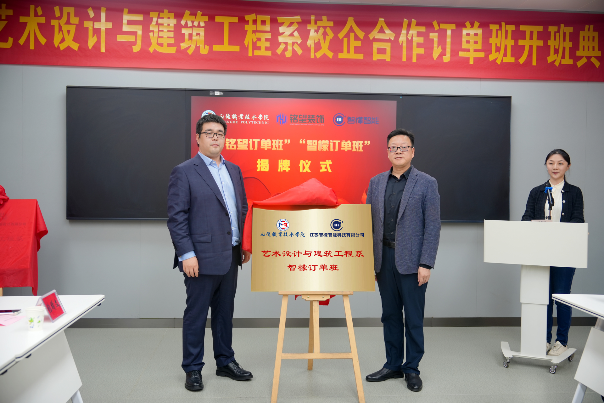 10月31日下午,艺术设计与建筑工程系成功举办了与南京铭望装饰设计有限公司、江苏智檬智能科技有限公司合作的“铭望订单班”与“智檬订单班”揭牌典礼。江苏智檬智能科技有限公司董事长温砚、南京铭望装饰设计有限公司总裁金海、我院副院长赵凯雷,院长助理、招生就业处处长王墀,以及校企双方领导、订单班专业教师及学生代表。一同参加此次揭牌仪式。