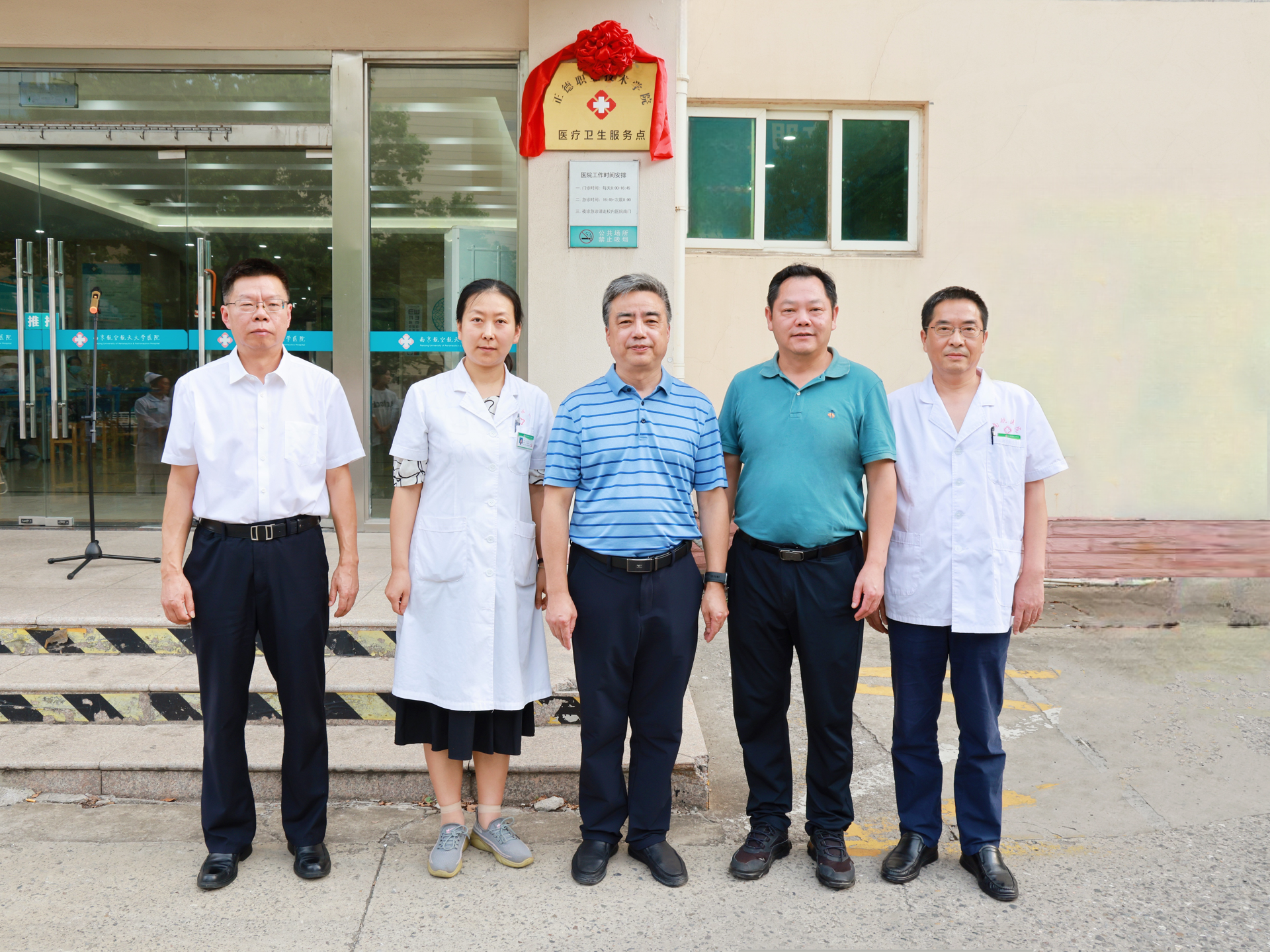 在与会人员的共同见证下,黄炳辉、孙永荣、陆晖、高斌、夏明川共同为正德服务点揭牌,随着红绸缓缓落下,正德学院医疗卫生服务点正式启用,标志着南航校医院优质医疗资源全面向我院师生开放。