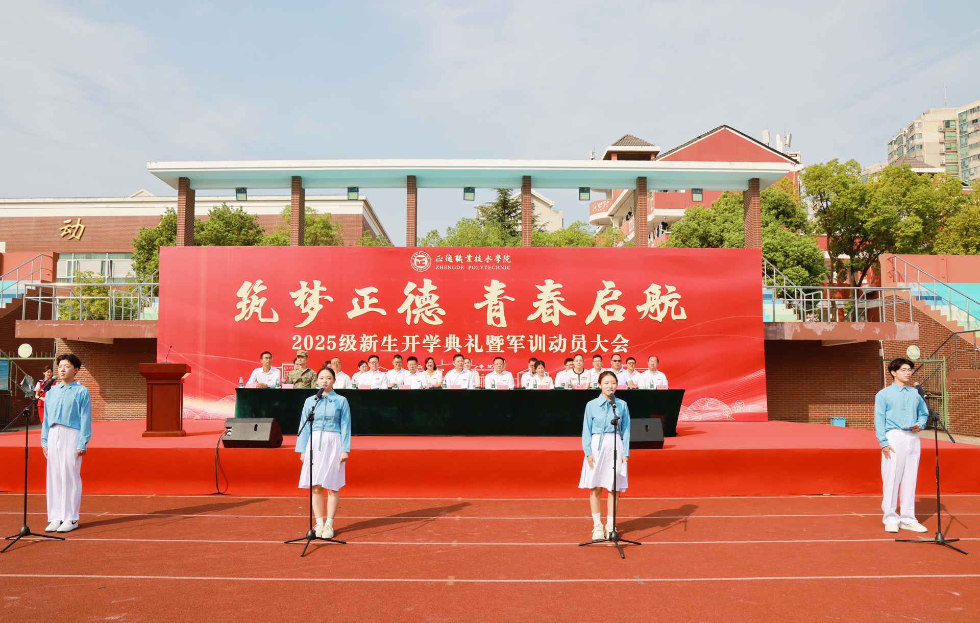 金风送爽启新程,青衿逐梦沐朝阳。9月17日上午,以“筑梦正德 青春启航”为主题的2025级新生开学典礼暨军训动员大会,在我院田径场隆重举行。全体院领导、院长助理,各系及相关单位主要负责人、全体新生辅导员,与3509名新生共同参会。中科院上海格思信息技术有限公司热控部主任陈谷雷、沭阳潼阳中学校长李健、承训部队代表刁嵘峥,以及我院2024届校友、南京国博电子股份有限公司戴立志应邀出席。大会由学院党委副书记、副院长梁薇主持。