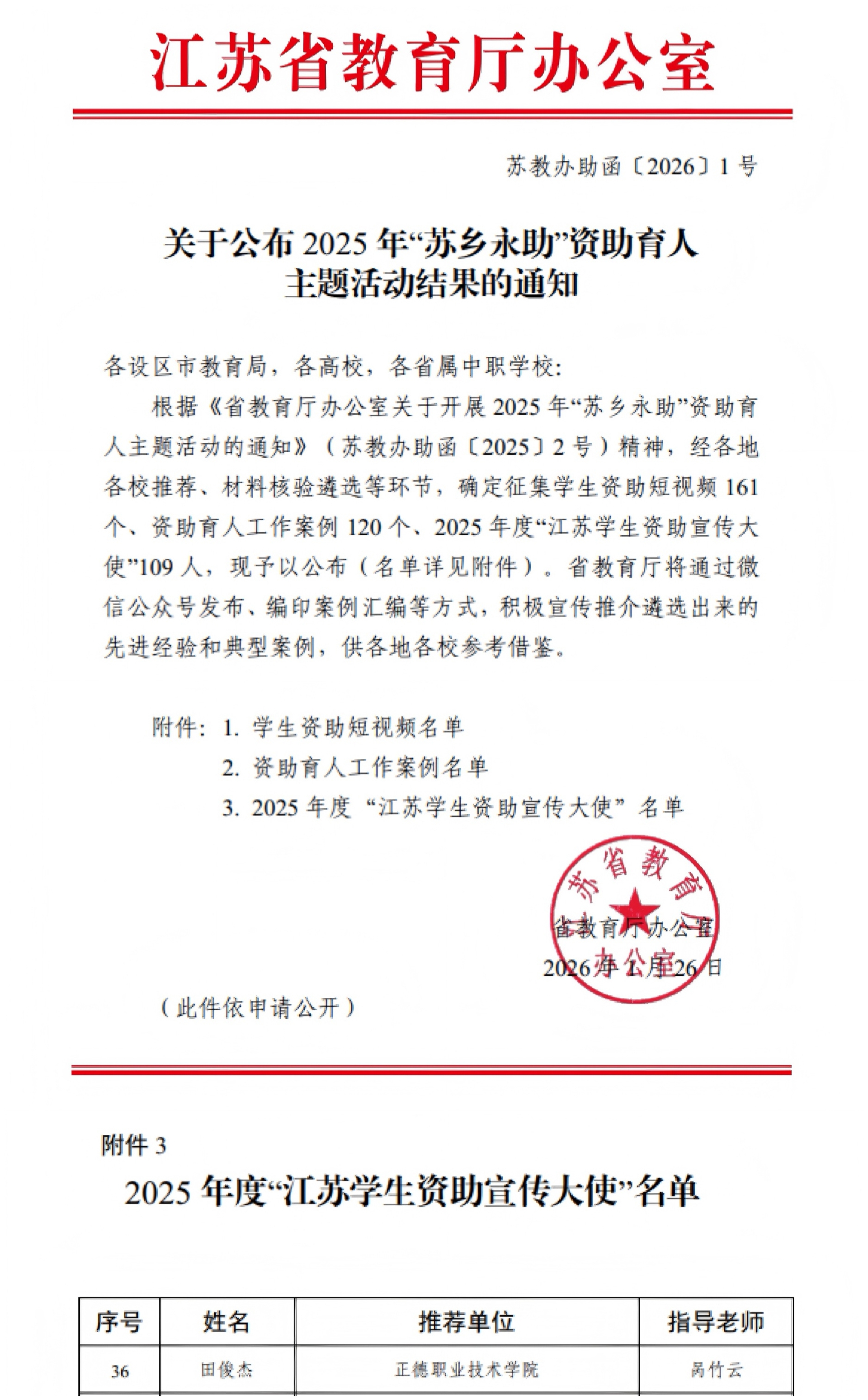 近日,江苏省教育厅公布2025年度“江苏学生资助宣传大使”评选结果,blh漫画 2023级经济与管理系大数据与会计专业学生田俊杰凭借扎实的宣传实践、突出的育人成效成功入选,以青春之力传递资助政策温暖。