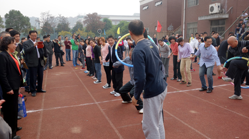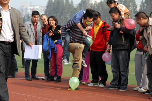 作为一项传统赛事,每年的教职工趣味运动会都成为整个运动会上最吸引人的部分。从上届开始,学院在制定比赛规则时,特意规定了每个教工代表队中,必须有学生参与,起到师生互动,增进了解的作用。比赛中,师生们携手并肩,积极参与,拼出了智慧,施展了能力,增进了情感;围观的啦啦队更是激情澎湃,助威声响彻校园,师生之间的团结和谐在此刻得到了最好的展现,成为每届校运会最大的看点。