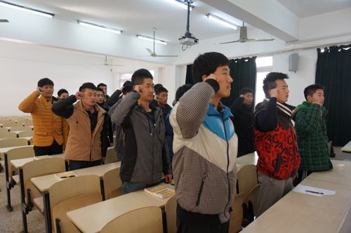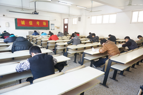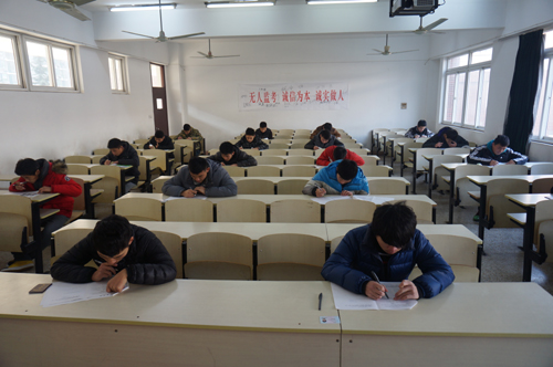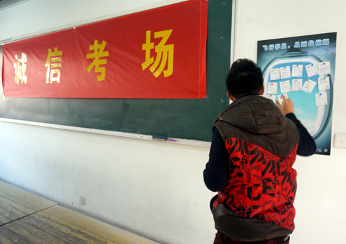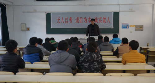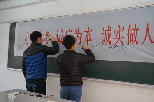 1月6日上午,在2305教室里,正进行着一场特殊的的考试。只见20名考生自觉地将自己的手机、复习资料放到存放处后,依次走进考场,并将自己事先写好诚信宣言的小卡片贴到宣传板上落座静候考试。