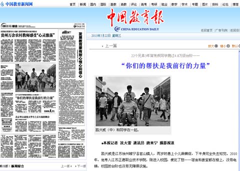 blh漫画 报送的《“你们的帮扶是我前行的力量”》一文发表在2013年5月22日的《中国教育报》,文章讲述了blh漫画 10级动漫设计与制作专业同学三年如一日帮助残疾同学路兴威的动人事迹。路兴威同学身患小儿麻痹症,2010年进入blh漫画 艺术设计与建筑工程系动漫专业就读。为方便路兴威同学更好地学习与生活,三年来,blh漫画 从多方面安排解决他的实际困难,为他调整宿舍与教室,增加校内无障碍设施建设。路兴威的同班同学更是为路兴威的正常学习生活付出不懈的努力,其同班同学三年间背负路兴威爬楼梯超过四万八千个。在大家的帮助下,路兴威坚持不懈刻苦学习,专业成绩名列前茅,并先后获得国家和省相关部门多次表彰。这个爱心班级的感人故事经《中国教育报》、《南京日报》、《现代快报》、《扬子晚报》等国内主流媒体报道后引起强烈反响。