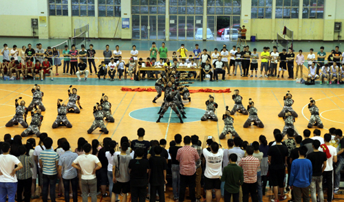 活动在舞蹈“迷彩英雄”精彩的表演中拉开序幕,该舞蹈由基础部刘翔老师指导,不久前代表学院参加江苏省第四届大学生艺术展演舞蹈比赛。同学们精彩的演出点燃了全场观众的激情。在接下来的篮球决赛中,刘小廷副院长为本次比赛跳球,随着裁判的一声哨声,比赛正式开始。两支队伍在比赛中实力相当,场上一次次比分的追平,快攻突破、防守抢断、篮板争夺、三分跳投等精彩瞬间,以及场下观众叫好呐喊声,将现场气氛一次次推向高潮。在中场休息时间,进行了院第一届啦啦操比赛,有经济与管理系、汽车工程系、艺术设计与建筑工程系、民用航空系五个系的代表队参加了比赛,各系的同学们自编自导的啦啦操,风格迥异,精彩的表演展示了同学们的青春活力与积极向上的精神面貌。下半场篮球赛更是激烈,双方每球必争,队员相互呐喊鼓励,完美体现了顽强拼搏的精神,团队合作的意识。