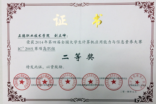 5月26日,“第四届全国大学生计算机应用能力与信息素养大赛”全国总决赛落下帷幕。我校代表队在本届大赛中表现优异,分别获得大赛IC³-2005组一等奖和二等奖的好成绩,其中电子信息工程技术专业的黄鑫获得一等奖,计算机软件专业的刘立坤获得二等奖。
