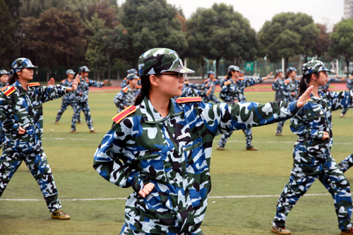 分列式汇报表演后、男子格斗摔擒敌表演,女子擒敌拳表演,军训教官摔擒敌表演,男子警棍操表演、女子匕首操表演依次上演。虽然阴雨天场地湿滑,但是军训学员和教官们全然不管,格斗中的呐喊声夺人心魄。由军训教官表演的战术队形更是把汇报表演的气氛推向高潮,数十名军训教官,手持钢枪,身穿防弹背心,墨镜遮眼,或一字型长蛇阵对敌攻击,或三人一组互相掩护,或持枪匍匐前进……,他们的表演充分展示了武警部队坚不可摧的战斗力。全场师生对其报以热烈的掌声。