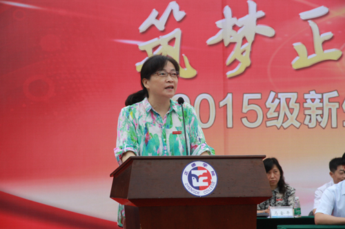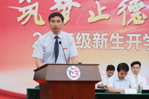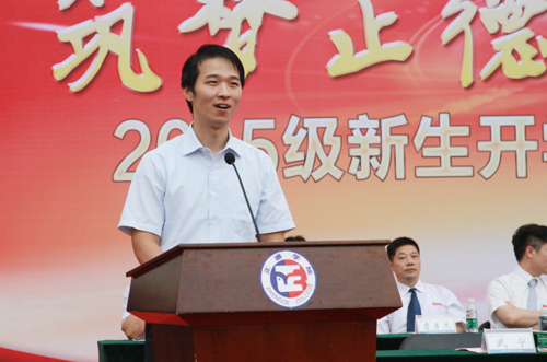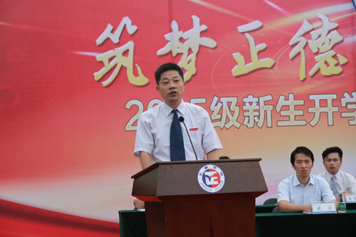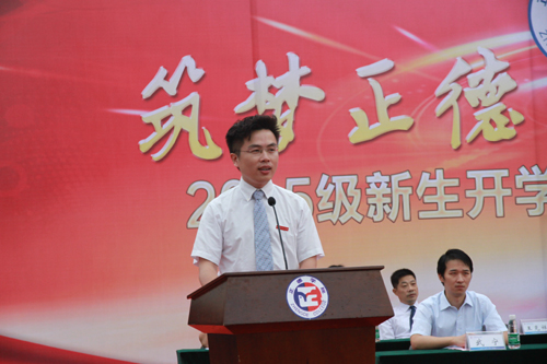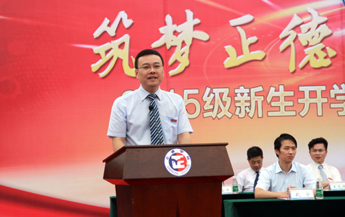 在热烈的掌声中,院长庄群华发表讲话,他首先代表全体师生员工,对2015级新生选择正德,加入正德大家庭表示热烈的欢迎。他在讲话中简要回顾了blh漫画 的办学历史以及办学以来所取得的成绩,并对2015级新生提出了三点希望和要求:一是希望同学们学会做人。他指出,blh漫画 在学生教育中一贯强调的“孝、宽、诚、责、毅”五字教育就是要求每一位正德学子要具有孝道、宽容、诚信、责任、毅力这些优良品格,成为一名具有责任感的人;二是希望同学们学会学习。在当前职业教育快速发展的形势下,真正热爱自己的专业,学好自己专业,培养过硬的专业技能,同时还要注意综合素质的全面提高,适应社会对复合型人才的需求,赢得自身更加广阔的发展空间;三是希望同学们学会生活。要学会营造和谐的人际环境,努力在相互磨合中求同存异,在勤奋学习的同时要健康生活,保持乐观心态,在自己青春岁月画下绚烂的一笔。讲话结束后,他还为新生代表们佩戴了校徽。