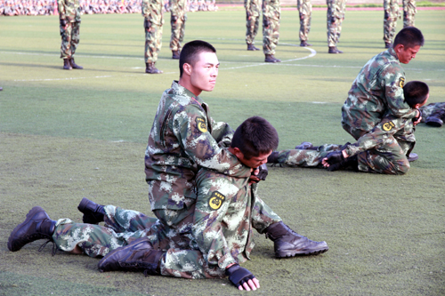 分列式结束后,同学们依次进行了战术演练救护、擒敌刺杀、女子匕首格斗术以及教官摔擒技术的军训科目表演。在战术演练救护表演中,以武警追捕犯罪分子为背景,融合了紧急集合、现地勘察、追击队形、搜捕队形、医疗救护和突击技能的融合,同学们的精彩表演,搏得了观众的阵阵掌声。擒敌刺杀、女子匕首格斗术的表演中,同学们“杀”声震天,展现出英勇无畏的气概。随后,教官摔擒技术将整个军训科目表演推向高潮。“