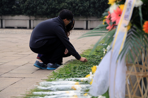 上午10点01分,全南京城拉响警报,在警报回响之际,经济与管理系45余名同学自发集中在一起,向南京大屠杀遇难同胞默哀。