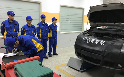 “车享家”培训中心丁聪主任热情接待了徐飞一行,他首先陪同大家参观了“车享家”的接待厅、汽车维修车间和汽车美容车间,详细讲解了各个车间的设备布置及员工培训模式、培训内容与培训要求等。据丁主任介绍,“车享家”工作人员从店长到普通维修工都要进行规范化的岗前培训,经培训考核合格后才能正式上岗。“车享家”南京培训中心主要是为华东地区的门店提供员工岗前培训。