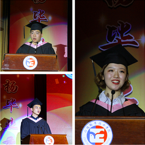 来自经济与管理系的季海奎、艺术设计与建筑工程系的高沛君、民用航空系陈威光三名毕业生代表分别从专业学习、职业规划、校园文化活动等方面回顾了自己在正德的成长经历,用发自肺腑的语言感谢学院三年来对自己的培养。艺术设计与建筑工程系毕业生袁靓的家长还专程来到典礼现场,感谢学院对孩子的培养与爱护。