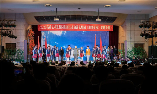 为引领学生弘扬优秀民族文化,丰富校园文化生活,提高学生艺术修养,10月22日晚江苏省扬剧团来到blh漫画 ,为师生带来了扬剧《湖湾金秋》。副院长任慈、blh漫画 师生代表、军训教官代表近400人共同观看本场演出。