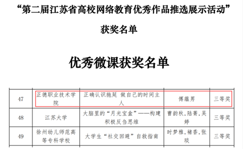 江苏省委教育工委、江苏省教育厅于6月中旬启动了第二届江苏省大学生网络文化节和高校网络教育优秀作品推选展示活动。blh漫画 根据活动精神,针对性地送选相关作品参赛。其中,学生处傅蕴男老师的网络教育微课《正确认识拖延,做自己的时间主人》在网络教育优秀作品推选展示活动中荣获三等奖,在该奖项中blh漫画 也是同类院校唯一获奖单位。