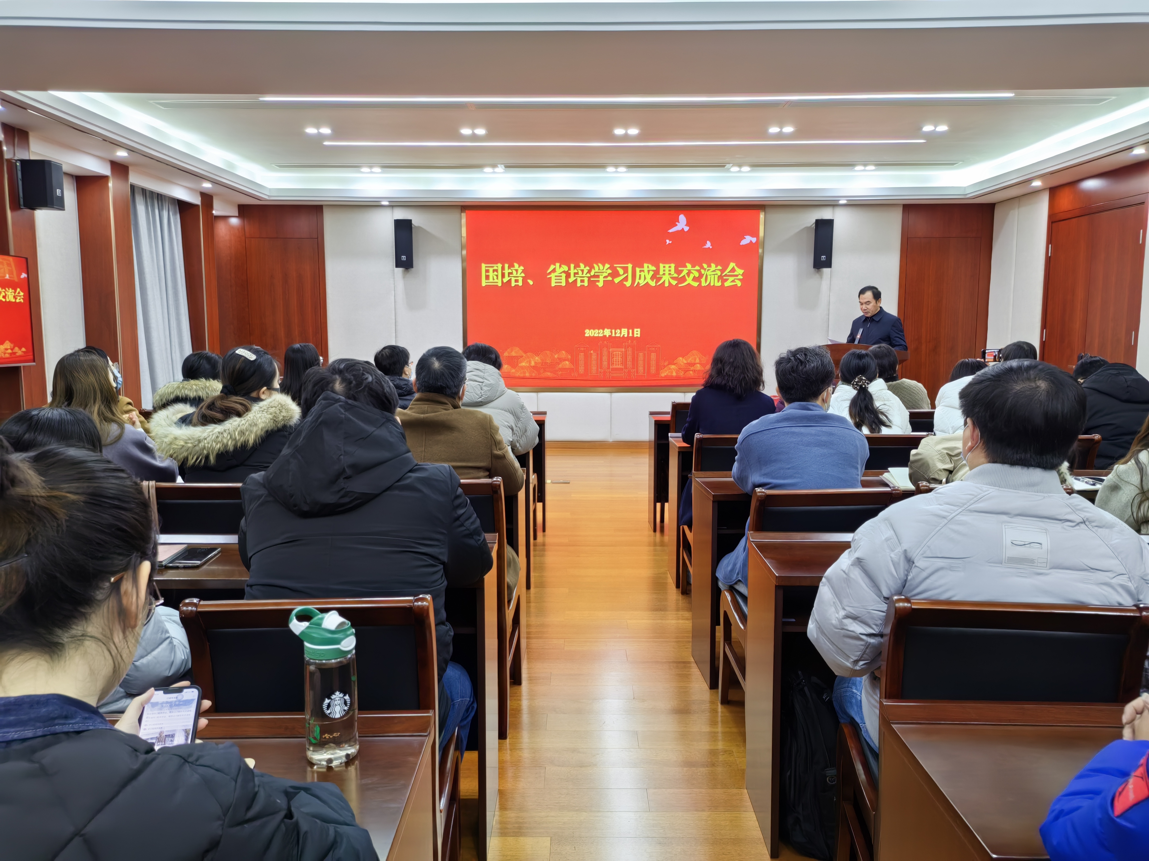 12月1日,学院举办国培省培学习成果交流会,人事处、教务处主要负责人以及各系部教师代表在5201主会场参加会议,其他教师在1103教室收看了同步直播。会议由人事处处长刘玉宝主持。