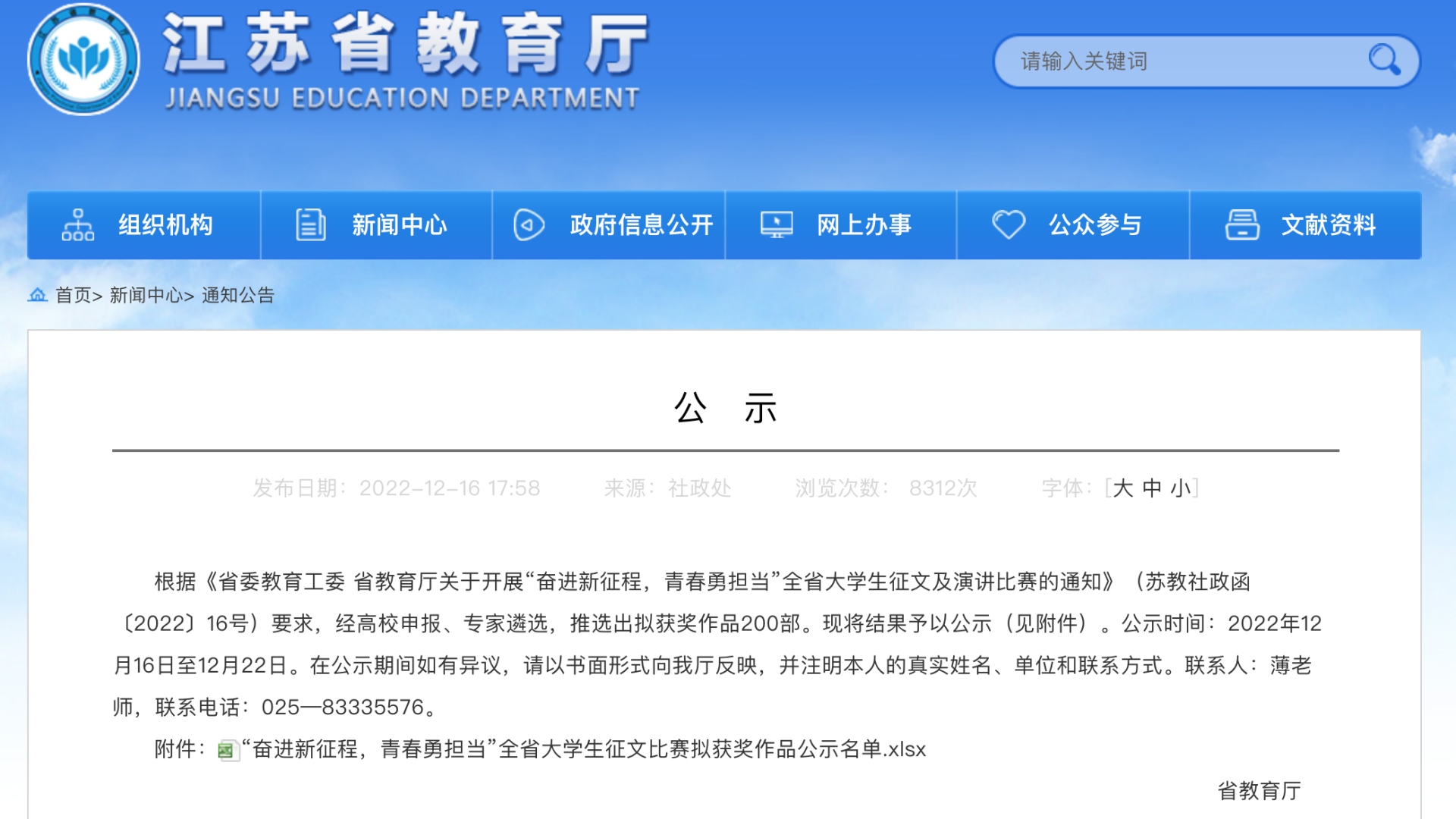 此次大赛以“奋进新征程,青春勇担当”为主题,比赛自10月底启动,历时两个月,全省百余所高校参与。blh漫画 收到通知后,高度重视,由团委牵头联合公共教学部与各系,在校内开展了征文选拔比赛,在全部学生参与的基础上,经班级初赛、系部复赛共选拔25篇稿件进入院级决赛,经过在线打分、评议讨论、专家指导等评审环节,选定3篇征文作品代表学校参加江苏省大学生征文比赛。