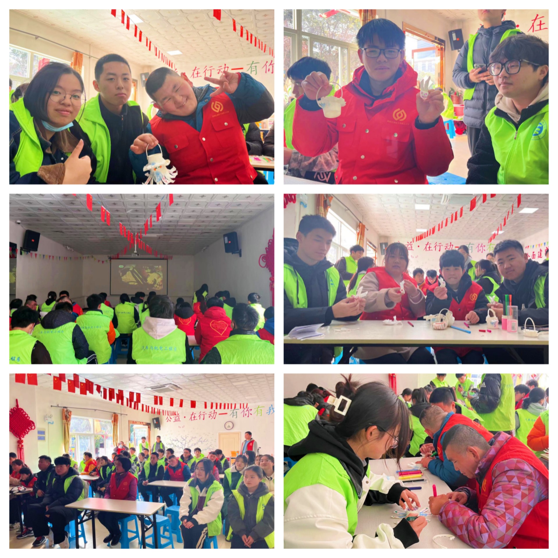 在学习交通规则环节,志愿者们通过PPT的方式,带着孩子们学习交通法规,让他们知晓遵守交通法规。最后,志愿者带着孩子们利用纸杯做手工制品,利用纸巾做出动物造型。不仅锻炼了动手能力,也加深了他们对废物再利用的认识。