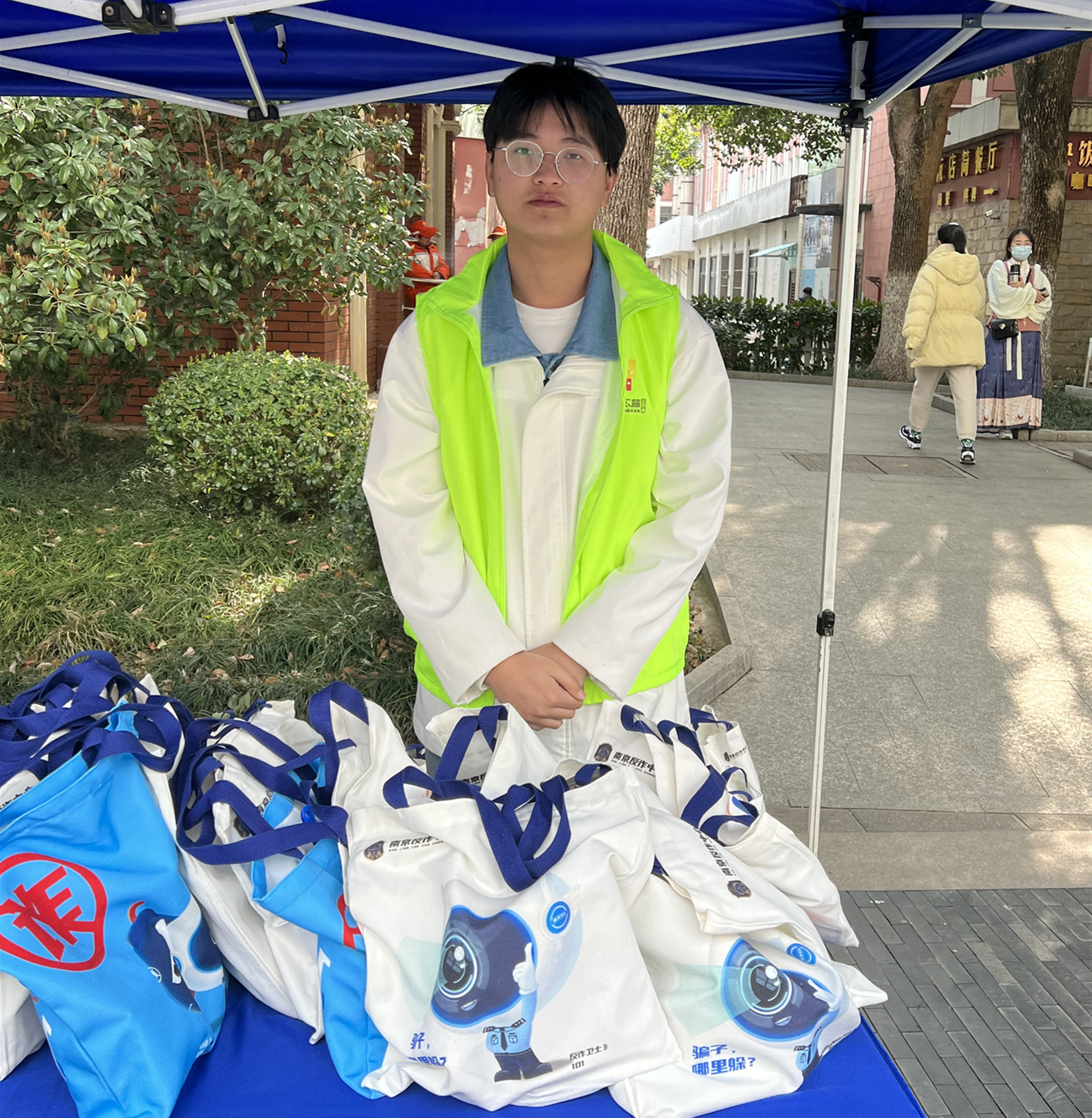 活动开始前,志愿者们就已经来到大行宫广场协助场地布置。反诈中心民警向志愿者简要解读了《反电诈法》的相关条例,并以辖区内的实际案件为例进行生动讲解,提醒居民不轻信、不刷单、不汇款,远离电信网络诈骗。