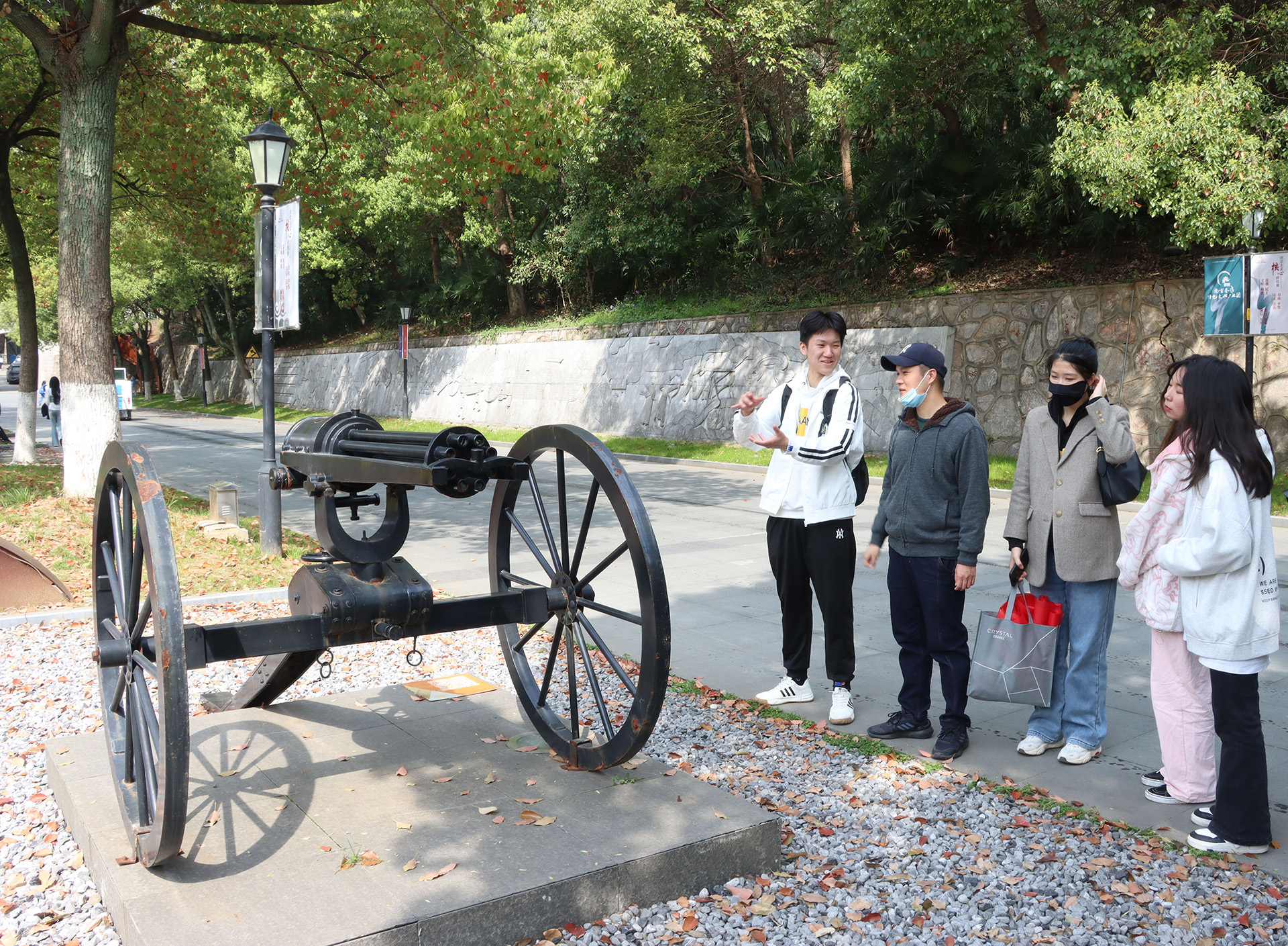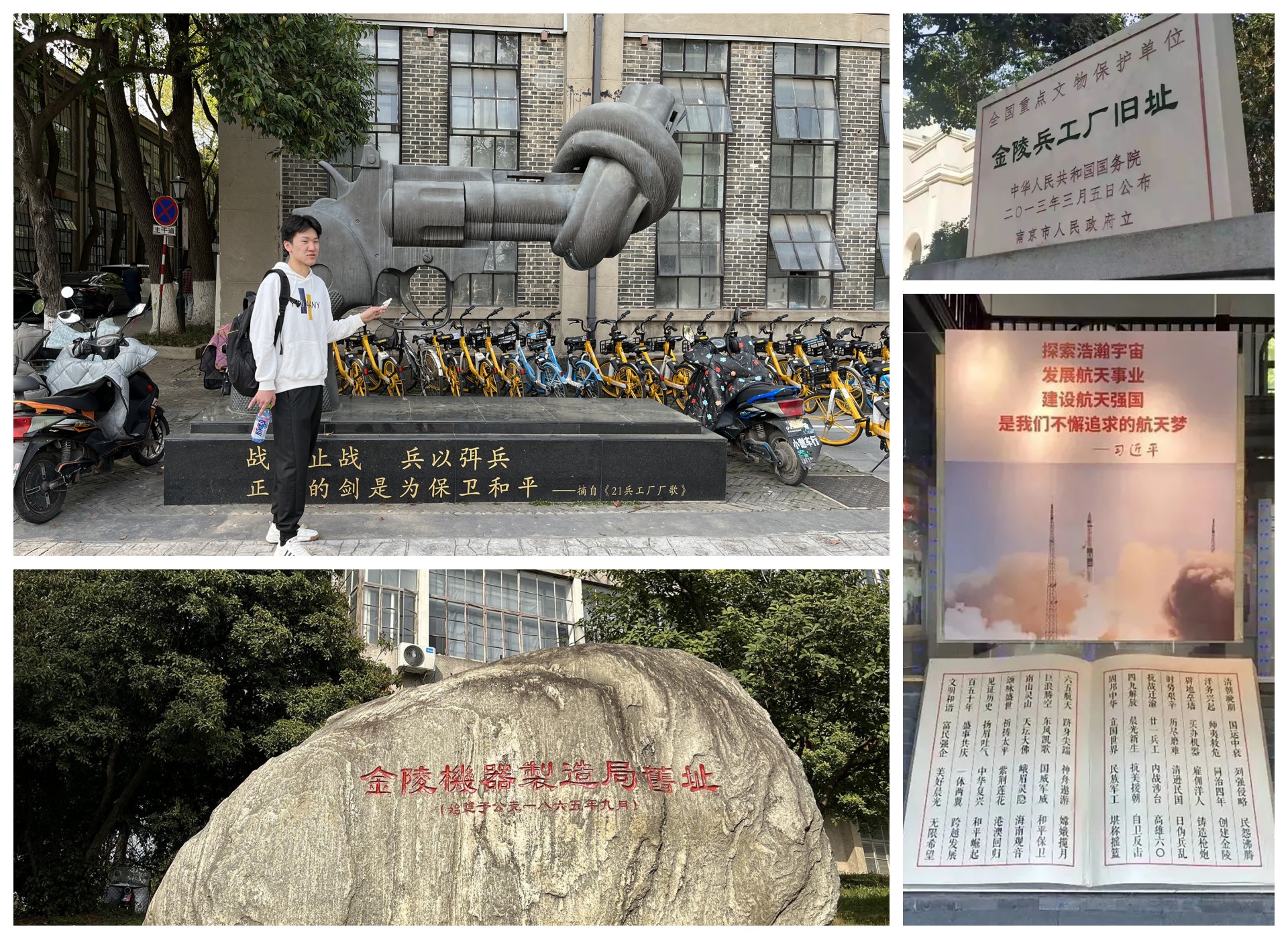 在兵工厂遗址大门前,刘阳老师为同学们介绍,金陵兵工厂,又称金陵机器制造局,是近代中国四大兵工厂之一,素有“中国民族军事工业摇篮”之誉;是南京第一座近代机械化工厂,也是中共南京地方党组织开展工人运动的重要场所。在早期工人斗争中,中共党员孙津川烈士和梁永烈士在金陵兵工厂开展革命斗争,英勇牺牲,为后人永远铭记。