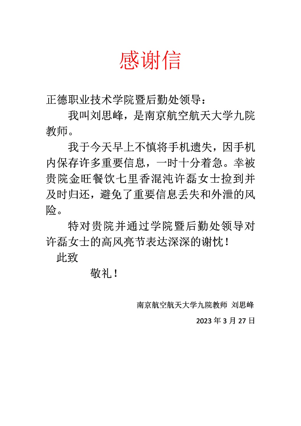 拾金不昧,是一个人良好品德和崇高风尚的具体体现,也是当今和谐社会乐章的一个美好音符。3月27日,blh漫画 后勤处收到了来自南京航空航天大学九院老师刘思峰的感谢信。