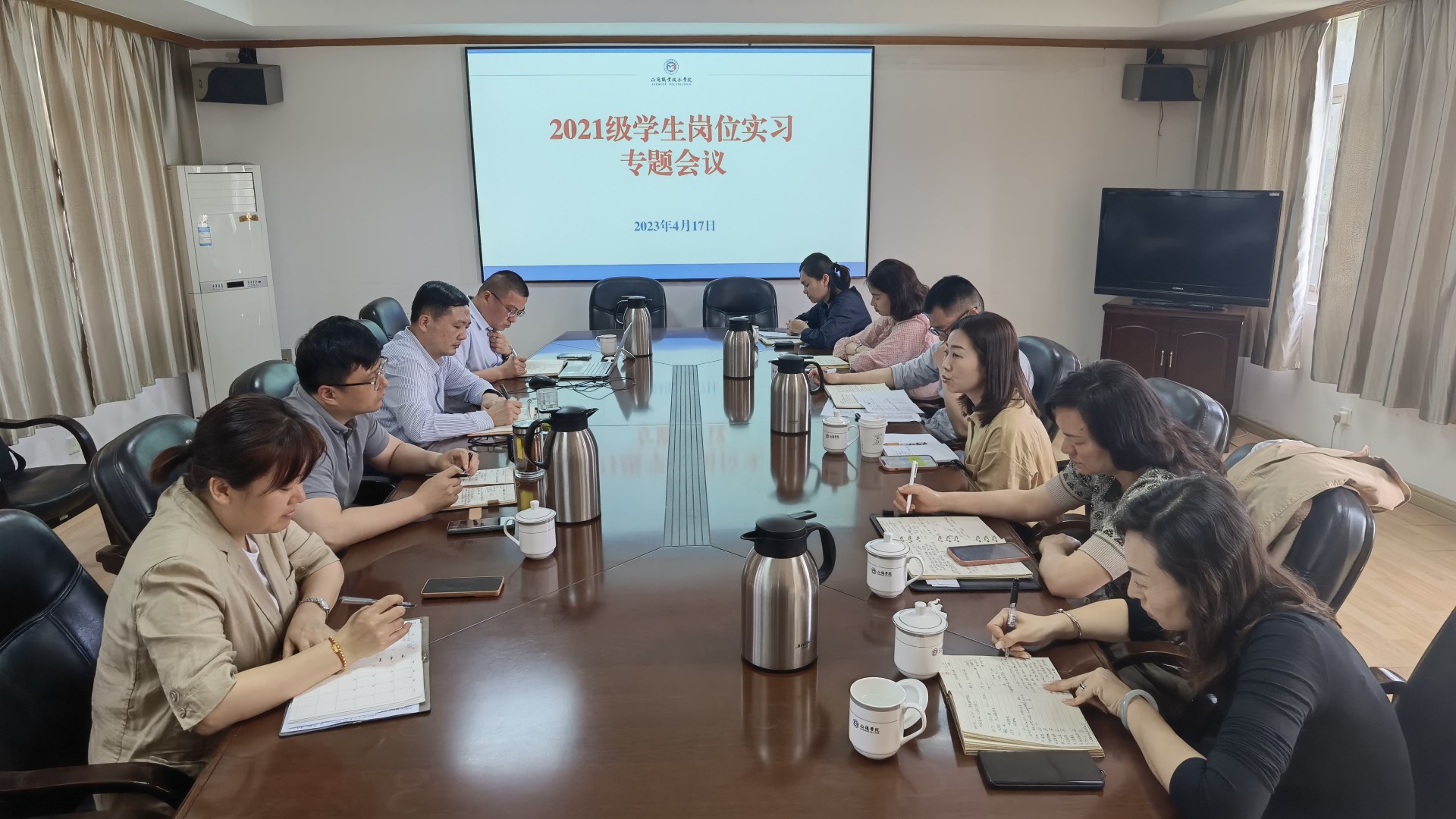 4月17日下午,学院召开2021级学生岗位实习专题会议,副院长江爱华,教务处、校企合作办、各系负责人等参加会议。